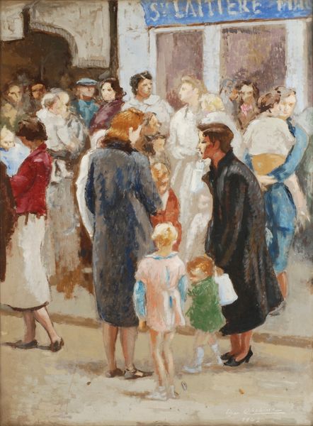 Editor: John Dodgson's "Under Arches, Rue de Seine" presents a fascinating scene! The figures seem almost staged, their gazes directed elsewhere. What cultural narratives do you see embedded in this piece? Curator: Consider the Rue de Seine itself, traditionally a space of commerce, leisure, and display. The figures, particularly the child, become symbols of modernity's anxieties and aspirations, evoking a sense of passing time. What memories do these figures stir within you? Editor: I hadn't thought of the street as a character itself. Now I'm struck by how the architecture frames their stories. Thanks for shedding light on the work's layers! Curator: It's in the layers, the subtle repetition of shapes and forms, that we can truly see the enduring power of visual symbolism.