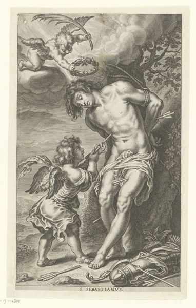 Editor: Here we have Hendrick Goltzius’s “Aarde,” an engraving from 1586. It strikes me as a powerful, almost assertive depiction of abundance, but also vulnerability. The figure, laden with fruit, seems almost burdened. What's your read on this engraving? Curator: The power dynamic between the representation of nature and its impact on the viewer is quite interesting here. Consider the period – this is late 16th century. Europe is emerging from religious conflict, scientific thought is challenging dogma, and art becomes a tool for projecting ideals of nationhood, wealth and control. "Aarde," meaning "Earth", aligns with that sociopolitical context. The cornucopia and the fecund landscape promote an idea of Earth’s capacity to fulfill human needs but the "burden" can also be understood as an argument for mankind´s responsibility for it. Editor: I see what you mean. It's not just about the bounty; it’s about control and responsibility at a time of immense social upheaval. The prominent nudity and classically inspired form contribute too, right? It reminds me of how rulers would commission portraits linking them to idealized historical figures. Curator: Exactly! Think of the institutions of art patronange during this period: Powerful families, nascent nation-states... The image presents a vision of terrestrial control to suggest earthly power. The public function of the arts shifted: The human body—idealized—stood for much more than religious morality or fidelity; it became intertwined with aspirations of terrestrial dominion. So how does the artist make us, the viewer, relate to "Aarde" politically? Editor: That's a shift in perspective I hadn't fully appreciated. Looking at it now, it does seem less a celebration of nature itself, and more a claim to ownership. Curator: Precisely. It showcases art’s inherent public role—consciously or not. And also prompts us to question: Who is represented? Who is empowered by this representation? Editor: Fascinating! It's made me see beyond the surface beauty of the engraving and understand the power structures it subtly reinforces. Thanks for this fresh approach.