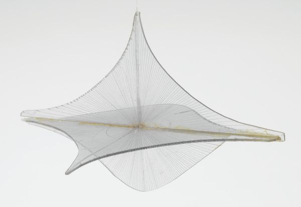 Naum Gabo created this model for 'Construction in Space, Suspended' using plastic. The delicate, translucent materials form a dynamic interplay between solid structure and ethereal openness. Gabo's Constructivist roots are evident in his choice to reveal the sculpture's internal framework. Notice how the geometric precision is softened by the subtle curves and the organic way light filters through the interwoven strands. This intertwining suggests a philosophy that seeks to redefine sculpture, not as mass, but as a system of spatial relationships. The sculpture challenges our perceptions of form and volume. It invites us to consider how art can be both tangible and immaterial, grounded and weightless, creating a dialogue between the artwork and the space it occupies. In essence, Gabo invites us to explore the poetics of space.