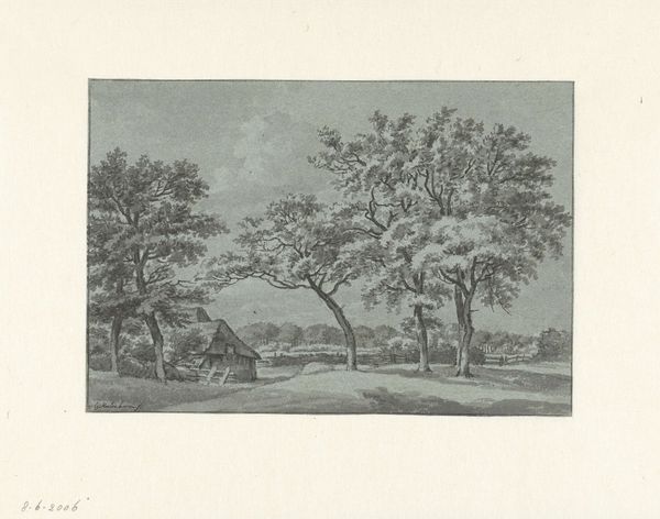 Editor: Here we have “Landscape with Three Farmhouses,” a pencil drawing on paper, likely from somewhere between 1794 and 1863, credited to Gerrit Hulseboom. It's quite serene, isn't it? The monochromatic palette lends it a sort of timeless quality, and I’m intrigued by the almost mathematical arrangement of the houses and trees. How do you interpret this work from a formalist perspective? Curator: The composition is immediately striking, is it not? The artist deftly employs a tripartite division, anchoring the landscape with three distinct clusters of structures. Consider the dynamism introduced by the road bisecting the scene; how its curves lead the eye into the implied depths. What compositional elements attract your attention? Editor: The lines of the trees, definitely. They create vertical movement, sort of counteracting the horizontality of the land. The tonal gradations are interesting, too, shifting from dark foreground to lighter background...is that creating spatial depth? Curator: Precisely. The gradations, achieved through delicate pencil work, contribute significantly to the spatial recession. Note, too, the use of varying line weights to define form and texture. The skeletal structure of the trees in contrast to the thatched roofs, each described with unique markings. Can we understand this not merely as landscape, but as an exploration of artistic technique, prioritizing the very materiality of drawing itself? Editor: So, it's less about representing the landscape literally, and more about the artist demonstrating his skill and exploring the possibilities of the medium itself? I hadn't thought of that! Curator: Indeed. It encourages us to contemplate drawing as a conceptual endeavor, privileging the aesthetic and structural possibilities inherent within. Consider how the light seems to delineate the planes in an abstract manner. Do you perceive how the light animates the depicted subject through these gradations in tone? Editor: Now that you mention it, the treatment of light is quite compelling! It does guide your eye throughout the piece. I see so much more in it now that you've pointed out these elements. Curator: Visual analysis refines our awareness, enhancing appreciation. Editor: I agree! This close look really shows how understanding composition elevates your understanding.