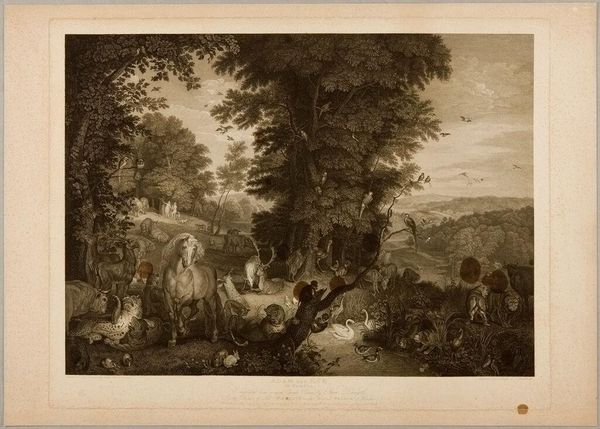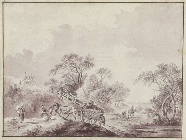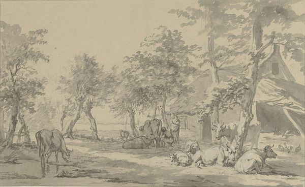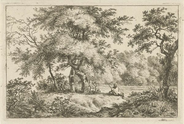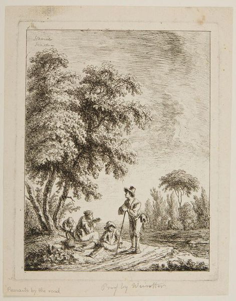 Curator: Let’s turn our attention to Claude Lorrain’s etching, "Landscape with a Country Dance," a large plate measuring approximately 20 by 26 centimeters. Editor: Oh, it's lovely. It feels like catching a fleeting moment in a dream—all soft light and gentle movement. What’s going on here? Curator: It depicts a pastoral scene, where country folk are gathered, perhaps celebrating. Lorrain was fascinated by imbuing landscapes with narrative and atmosphere. Editor: There’s this interesting tension between the playful dance and the slightly haunting stillness of the landscape itself. Are those goats? Curator: Indeed! Details like those goats, and the figures resting under the trees, give us a glimpse into rural life and the role of leisure within it. Lorrain, of course, worked for wealthy patrons who likely viewed such scenes with romanticized detachment. Editor: Right. So, it's both a celebration of the countryside and, in a way, a reflection of the social distance between the artist’s patrons and the people they’re observing. Interesting how a simple scene can hold so much. Curator: Precisely. And it's this complexity, this layering of meaning, that makes Lorrain such a compelling figure in art history. Editor: Makes you wonder about the stories these folks could tell, beyond the dance.