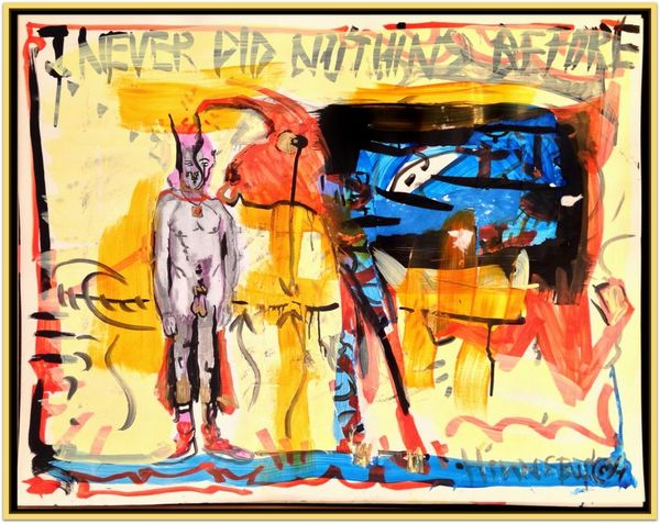 David Michael Hinnebusch made "Where," using paint on canvas. The painting is a whirlwind of expressive mark-making, executed with bold, gestural brushstrokes. The raw canvas is allowed to peek through in places, adding to the sense of immediacy and urgency. Hinnebusch's application of the paint is frenetic, almost violent, as if he's wrestling with the material to get his vision across. This type of expressionism is a direct descendant of Abstract Expressionists like Willem de Kooning. While the style and materials align with traditional painting, the energy evokes a very contemporary feeling. The painting is a record of a performance, the residue of the artist's physical and emotional engagement with the canvas. By focusing on the materiality and process of this painting, we can understand the labor and intention that go into its creation. It highlights the importance of considering the artist's hand and the context in which they were working to fully appreciate the artwork.