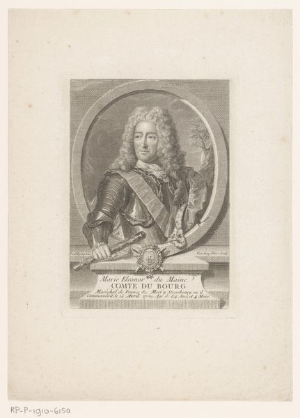 Editor: Here we have Johann Martin Bernigeroth's "Portret van Albrecht Wolfgang Graf zu Schaumburg-Lippe," made sometime between 1728 and 1767, a print consisting of etching and engraving on paper. It's striking how much detail Bernigeroth was able to get with etching and engraving alone! What should we make of a portrait done in print form, in terms of its creation and reception? Curator: Precisely. It's crucial to consider this portrait not just as an image of a count, but as a produced object, conceived and consumed in a specific socio-economic framework. Think about the materiality of printmaking. Engraving and etching were labor-intensive, requiring specialized skills and workshops. Editor: So the creation of this artwork relied on many different laborers, from the artist, to the paper maker and more... Curator: Yes! And consider the implications of *printing* a portrait. Unlike a unique painted portrait commissioned exclusively for the sitter or his family, a print suggests wider distribution and a different kind of viewership. It speaks to notions of status and power made available – though likely at a cost – to a broader segment of society. Were these prints a means of disseminating the count's image, and if so, to what end? Who was the target audience? Editor: That makes me rethink my initial assumptions about portraiture as purely commemorative. It's much more tied into labor and capital, than I thought! Curator: Exactly! Look closer: the aging of the paper stock, itself a crafted material; the specific techniques of line engraving chosen... all contribute to the artwork's meaning as a produced, circulated, and consumed commodity, one tied directly to both the subject *and* its audience's aspirations. Editor: I never considered the economic implications and access granted through printing! It reshapes how I view portraiture altogether. Curator: Understanding art through its production and circulation reveals complex social relationships otherwise obscured by conventional aesthetic analysis.