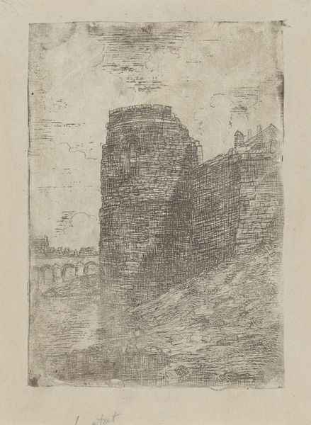 Editor: This etching by Alexander Schaepkens, dating sometime between 1830 and 1899, is titled "Maaspunttoren in de stadsmuur van Maastricht." It feels both solid and transient at the same time, especially the way the artist plays with light. What catches your eye in this print? Curator: The Maaspunttoren represents more than just architectural realism. Think about city walls: they speak to power, protection, exclusion. This image, frozen in time, compels us to consider the dynamics of who is inside, who is outside, and who controls access. Maastricht, positioned on trade routes, was intensely invested in those separations, both practically and symbolically. What narrative does this crumbling, yet imposing, tower evoke for you? Editor: I suppose I hadn't considered it beyond the aesthetic, but now I'm wondering about how the tower functions as a representation of civic power and the control of resources. Its decay could be a sign of changing times, a challenge to that power. Curator: Precisely! And consider the very act of etching itself. This print allows for dissemination, a democratization of the image of power. Who gets to see it? Who can own it? It creates a dialogue far beyond the physical walls of Maastricht. Do you see any relationship to contemporary discussions of borders, migration, and access? Editor: Absolutely. Thinking about it that way makes this historical piece incredibly relevant to today's socio-political climate. Curator: Art helps us see those connections. The tower, then and now, compels us to question what barriers we construct, both literally and figuratively. Editor: Thank you, I never would have considered this piece with such nuance on my own!