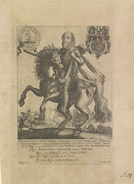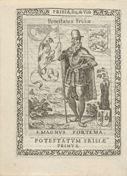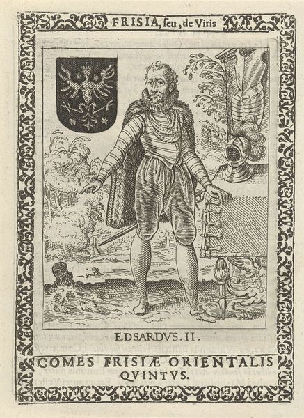 Curator: Standing before us is a print dating back to the early 17th century, around 1618-1620. It is titled "Enno III, zesde graaf van Oost-Friesland" and was created by Pieter Feddes van Harlingen. The Rijksmuseum is fortunate to hold it within its collection. Editor: My first impression is one of formality and perhaps a touch of melancholy. The figure, Enno III, is rigidly posed, his armour suggesting readiness for conflict, but his gaze seems distant. The use of graphite in the engraving adds to a serious atmosphere, doesn't it? Curator: Indeed. The material process is very important here. Engraving, especially at this time, was as much a tool for dissemination as artistic expression. The graphite and the resulting lines are themselves a mark of that social role, think of the skill needed. These prints were important as historical record keeping but it also highlights his role as leader to those beyond his immediate court. Editor: Precisely. The symbolic language employed reinforces his authority. We have the armorial shield prominently displayed and note how his helmet is placed casually, to the side, suggesting victory and control but then also pointing at how quickly one can be at war again, he is still dressed in his war garments for this purpose. Even the landscape in the background contributes, doesn't it, to this sense of established power? Curator: Without question. I am curious though, about what we may be missing, who engraved this? Did they hold favor with the count, or was it a more generic studio offering this likeness for coin? Knowing that level of artisan is vital, surely. Editor: It does highlight the collaborative aspect, right? Someone had to translate the image, physically labouring over it. That element of production deeply influences its meaning and reception. Yet, the choice of symbols, their arrangement, are clearly geared toward presenting a carefully crafted image of power. The ornamentated border, its inclusion with heraldry further serves this effect, rooting Enno III within a specific lineage and historical narrative, perhaps of Frisia and how proud it once was, looking at the inscription? Curator: Exactly! Looking at his clothing material culture allows us a glimpse into courtly life in 17th-century East Frisia, reflecting the availability and trade of those supplies within that society. A fascinating convergence of image, process, and social framework, all within this single sheet of engraved graphite. Editor: Indeed. Reflecting on this piece, I’m struck again by the potent language of symbols. Even in this seemingly straightforward portrait, layers of meaning from military power to cultural heritage reveal themselves, creating a dialogue across centuries.