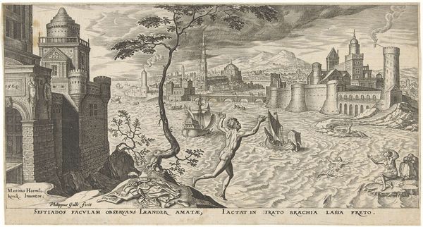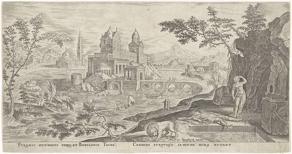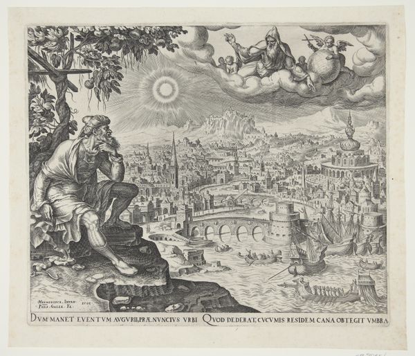 Philips Galle made this print, “Landschap met Elisa, die de mantel van Elia ontvangt,” using the intaglio process of engraving. Engraving is a skilled process that involves using a tool called a burin to carve lines directly into a metal plate, usually copper. The plate is then inked, and the surface wiped clean, leaving ink only in the engraved lines. When pressed against paper, the ink transfers, creating a precise and detailed image. The striking clarity and fineness of line seen in this print are characteristic of engraving, allowing for intricate details and tonal variations. Galle has used these capabilities to create a rich landscape filled with architectural ruins and dramatic skies. The method of production mirrors the themes in the artwork. The labor-intensive engraving mirrors the transformative biblical narrative, asking us to consider the work involved in acts of devotion and creation.