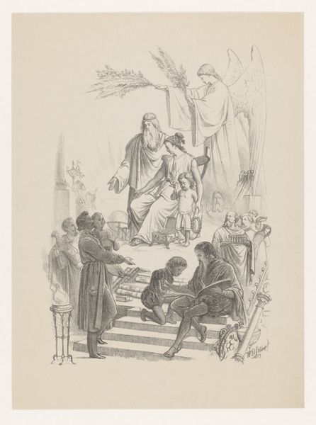 Curator: This is a reproduction of a drawing from 1890 by F.A. Dahlström, depicting Ludwig Chronegk leading a rehearsal of Julius Caesar. It's rendered in pencil. Editor: My first thought? A sense of contained chaos. There's such detail packed in, all rendered in gray tones that feel both serious and fleeting. What are your thoughts about it as a material object? Curator: What interests me is how it reflects power structures in theater and broader society at the time. Chronegk, standing elevated, bell in hand, directs a Roman army, alluding to imperial themes and raising interesting questions of cultural appropriation in theatre. Editor: Precisely. It seems the production's means were extensive--those elaborate Roman costumes didn't materialize out of thin air. Consider also, that this "drawing" is itself a "fotoreproductie," which creates another remove in the production process. Curator: I agree; these themes extend beyond stagecraft. This scene evokes ideas of leadership and performative authority. The dynamic reminds us that performance has power dynamics embedded in production; who tells the story, and from what perspective? And who gets to create what kinds of narratives, drawing upon historical precedence? Editor: Absolutely. I see that contrast highlighted in the materiality— the delicate pencil lines capturing these bombastic figures, but also suggesting an instability inherent in such performative acts. The costumes themselves, carefully constructed through intense labor, exist for one purpose – illusion. Curator: Right. The work’s meticulousness shows an interesting focus on production value in art and theatre. In what way did Dahlström perceive the creative, or reproductive labor here, if at all? Editor: He definitely elevates what would ordinarily be deemed support roles--tailors, carpenters, set designers, etc. As this drawing shows, their contribution shapes not just what we see, but ultimately what is felt and understood. It makes us consider art beyond the artist. Curator: Indeed. Thinking through its many layered contexts enriches our understanding, right to the modern reproductions in museums that let more people view it! Editor: Definitely; it moves us to consider value in these social and theatrical constructions that we have, still.