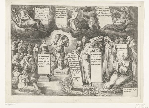 Curator: We’re looking at the "Titelprent van Passio, mors et resurrectio dn. Nostri Jesu Christ," created by Philips Galle between 1585 and 1586. It's an engraving, done in the intaglio printmaking technique, currently held at the Rijksmuseum. What’s your initial reaction to it? Editor: It feels like a carefully constructed stage for a profound story, somber, theatrical. The line work is so precise. Almost like watching a memory being precisely recalled. Curator: That's a fitting description. Galle, working in the Northern Renaissance tradition, was very interested in imbuing images with layers of symbolic meaning. Take the Passion, Death, and Resurrection depicted, with associated iconography from saints. What emotional weight does that imagery hold now, do you think? Editor: Well, Galle clearly situated this at a critical point in religious history. Images such as this are a stark reminder of the role art played in disseminating and reinforcing narratives, solidifying beliefs that have subsequently fueled social division, persecution, and immense power structures. Curator: That’s an astute observation. The engraving style, with its emphasis on clear, precise lines, reflects the clarity of doctrine that was sought at that time. Notice, the way figures kneel before their emblematic animals? St Mark and his lion, St. Luke and his ox? How these animals act as witnesses. The evangelists are receiving inspiration for their texts, creating scripture. Editor: Exactly! And it’s worth considering who was able to read those texts. For the largely illiterate population, images like this functioned as vital conduits of information and ideology, dictating a certain moral and spiritual order. They served a particular cultural agenda. Curator: I see your point, but perhaps there's something timeless here as well. Galle’s arrangement and use of symbolism evokes something powerful for all those who can witness the scene. Look at the depth created. Figures and expressions. It serves as a mnemonic aid. A visual representation of important religious content. Editor: I agree with that to some degree. The way Galle combined so many events in a unified pictorial space tells us so much about 16th century methods of religious communication and control. It shows how a particular cultural memory was actively constructed. Curator: Examining its themes and recognizing Galle’s attention to symbolic visual order help us not only decode the religious message, but understand better how the artwork impacted the people of its time. Editor: And interrogating these historical power structures reveals so much about the impact images can have on constructing ideologies. A constant push and pull between history, narrative, and faith, it’s quite thought provoking.