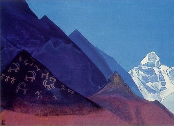Curator: Standing before us is Nicholas Roerich's "The Philosopher. Silence.", created in 1940 using tempera. What strikes you immediately about this work? Editor: Well, there's a profound stillness that emanates from it. The muted blues and reds, the solitary figure against the colossal mountains, create a powerful sense of contemplative solitude. It feels like a visual representation of inner peace, but perhaps also isolation during wartime. Curator: It’s fascinating how Roerich employs such simple materials and a somewhat flat, almost mural-like application of paint to convey complex spiritual ideas. Tempera lends itself to that matte finish, which avoids any distractions from the symbolic content. Did the economic and political backdrop of 1940 play a role, encouraging such austerity? Editor: Absolutely. Looking at the socio-political context of 1940, amidst the escalating horrors of World War II, Roerich, a known theosophist and advocate for peace, positions silence as resistance. The philosopher, perhaps a sage, finds solace and strength not in the noise of conflict but in internal reflection, possibly symbolizing a commitment to inner work during global unrest. The symbolic resonance is incredibly relevant, particularly through today’s polarized discourses and their connection to our own ethical consumption habits. Curator: Considering Roerich's fascination with Eastern philosophy, I find the use of tempera significant. The colors achieve an interesting vibrancy, reminding me of pigments used in Tibetan thangkas. Editor: Precisely! The choice of tempera contributes to this specific visual language deeply embedded in spiritual and artistic traditions from Central Asia, emphasizing silence not merely as an absence of sound but as a potent, transformative space for growth—offering us a powerful visual experience, reminding us to reflect, listen, and find inner stillness during challenging times. Curator: It certainly offers a different perspective on Roerich’s work by moving away from the grandeur typically seen in his Himalayan landscapes. Here, we have a stripped-down essence of his artistic vision. Editor: Indeed. It compels us to reconsider the raw materials from which cultural narratives are built, to challenge dominant voices, and amplify marginalized experiences and stories.