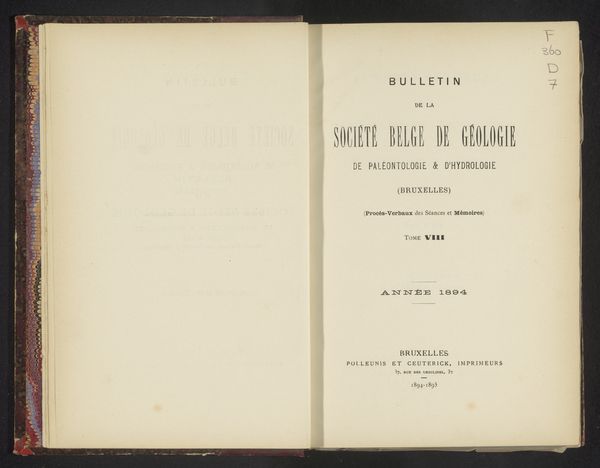 Editor: Here we have an open book, “Bulletin de la Société belge de géologie, de paléontologie et d'hydrologie,” created in 1892. The printers are listed as Polleunis et Ceuterick. Looking at the typography, it feels… academic, precise. What strikes you most about this? Curator: Ah, typography! More than just letters, wouldn’t you agree? For me, gazing at that page is akin to peering through a time portal. It’s not simply *what* it says – geological society proceedings, for heaven’s sake, though even dirt has a story if you listen closely! It's *how* it says it. Each font choice, the spacing, the deliberate weight of the words. It whispers of a Belgium gripped by a fervent desire to classify and comprehend its earth. Imagine their spectacles perched precariously as they pour over newly-unearthed fossils, bathed in gaslight, perhaps debating some particularly stubborn stratum! Editor: That makes so much sense. It's interesting you mentioned a 'desire to classify.' That makes me think, what makes it art? Curator: An excellent question! Does something need paint or marble to be "art," hmm? Is art not embedded in deliberate decisions of craft? That book was crafted! Observe the conscious restraint. This page is an altar to rationality! Now, where are those dusty Belgian geologists to defend their science turned beauty? Editor: You’ve completely transformed my perspective on typography. I usually just see it as…words. Curator: Exactly! We must savor those unassuming forms as the vessels that hold so much more. To notice, to question — *that’s* when everyday typography does its hidden little pirouette!