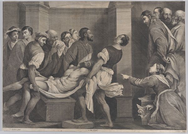 Giovanni Battista Pasqualini created this print, The Death of Saint Cecilia, in the early 17th century. It illustrates the death of Saint Cecilia, the patron saint of music, within a Roman interior. This work offers insights into the cultural and religious values of its time, reflecting the Catholic Church's emphasis on martyrdom and saintly devotion during the Counter-Reformation. The image creates meaning through visual codes and cultural references, such as the angel holding a wreath above Cecilia, symbolizing her heavenly reward. The attention paid to the architecture could allude to institutional settings such as the church, whilst the classical statues placed within niches are a reference to the artistic tradition. Understanding the cultural and institutional history of Pasqualini's time allows us to appreciate the artwork as more than just a religious depiction, but also as a reflection of the complex interplay between faith, power, and artistic expression. Historical resources will allow researchers to dig deeper into the meaning of the artwork.