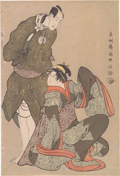 This woodblock print, titled "Viewing Maple Leaves (Momijigari)", was created by Kitao Shigemasa, an artist working in Japan during the Edo period. Shigemasa produced this print as part of a series called "Dance Customs of Captivating Figures". During the Edo period, urban centers like Edo, now Tokyo, saw the rise of a vibrant merchant class and with it, a rich artistic and cultural scene. The series this print belongs to reflects this burgeoning interest in the lives and customs of the city’s captivating figures, like geishas and courtesans, who shaped trends in fashion, beauty, and entertainment. The woman depicted is likely a high ranking courtesan participating in the popular autumn activity of Momijigari, or viewing the changing maple leaves. The print delicately balances a traditional subject with emerging cultural trends in Japan. It provides us with a glimpse into the ephemeral beauty of performance, and the quiet contemplation of nature’s beauty.