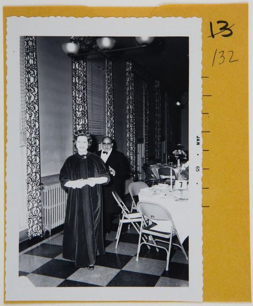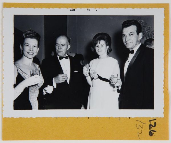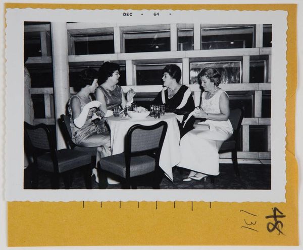 This untitled black and white photograph of a group at a party was taken in December 1964 by Robert Burian. The formal arrangement of the figures is immediately striking: men in dark suits stand behind seated women, creating a tiered effect. This composition isn't just a neutral recording of a social event. Burian has framed the scene so that the grid-like architectural background becomes a structural element, mirroring and perhaps subtly commenting on the social structure. The stark contrast between light and shadow adds to this effect, highlighting the geometries of the space and the patterns of social interaction. Consider how the contrast in textures, from the smooth faces to the patterned dresses, adds depth. Burian uses these formal elements to dissect the scene, inviting us to consider not just who is present, but also how they are arranged and what underlying codes dictate their positions. It's a fascinating glimpse into a moment, meticulously constructed through the photographer's eye.