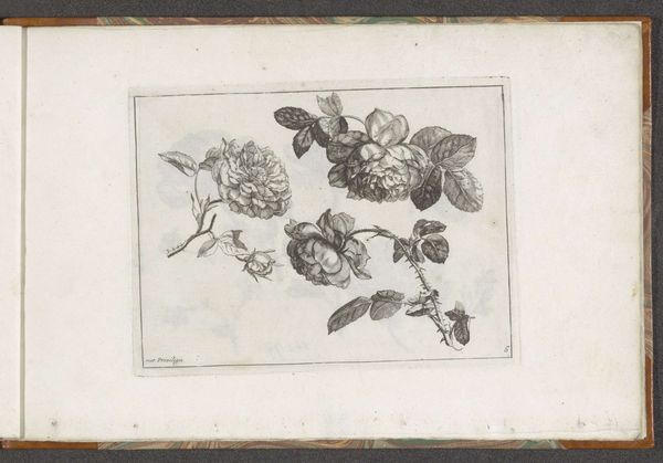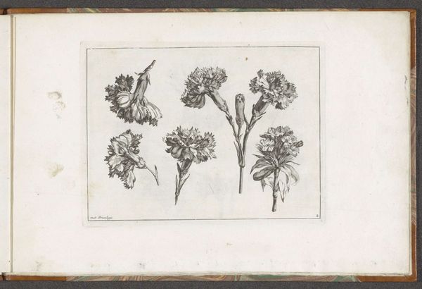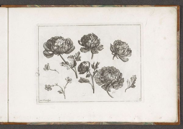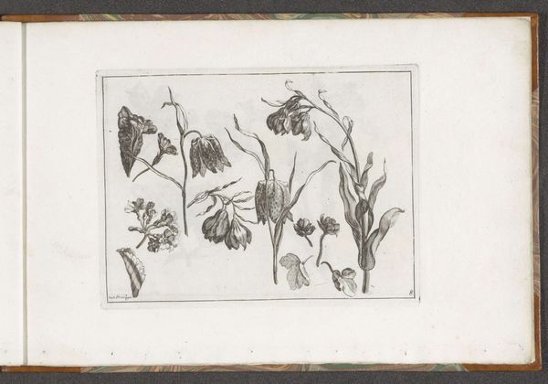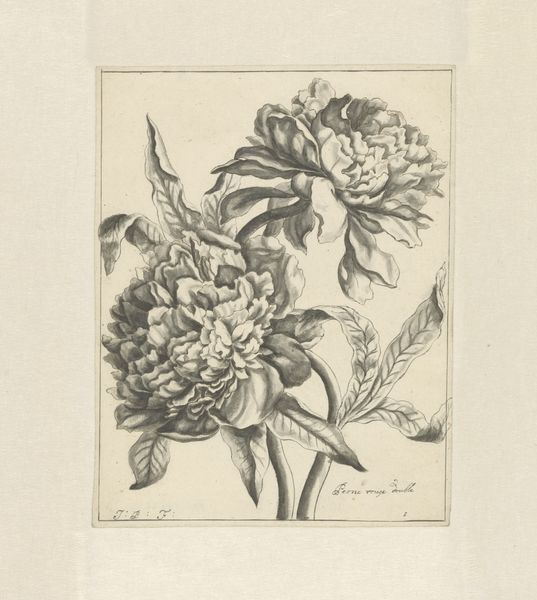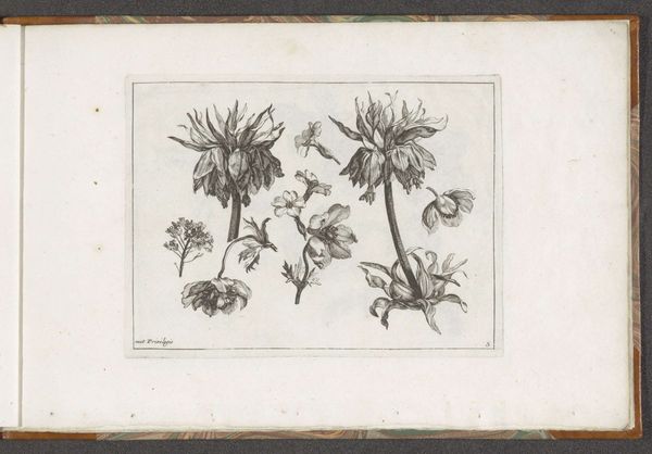 Curator: This exquisite engraving, "Zonnebloem en narcis," or "Sunflower and Narcissus," dating back to the period of 1630 to 1718, presents a stark beauty against the aged paper. I believe it's attributed to an anonymous artist. What do you think of its initial impact? Editor: There’s something deeply melancholic about it. The stark contrast and wilting forms suggest a meditation on time and mortality. I can almost feel the impermanence radiating from those delicately etched lines. Curator: It’s interesting you say that, because I immediately felt a kind of stoic resilience in that massive sunflower. Perhaps it’s a stubborn refusal to succumb entirely. And the positioning with the narcissus, a symbol of vanity and self-absorption... maybe it's an intentional juxtaposition? Editor: Absolutely, and given the tumultuous socio-political context of the time, one can read this contrast through the lens of societal decadence versus the plight of the marginalized. Is the artist perhaps hinting at the self-serving nature of power structures as they neglect the common good? Curator: That’s a perspective I hadn't considered! To me, the botanical study seems to highlight a personal engagement with the natural world, an exploration of forms more than an explicit political statement. The fine detail of the engraving – the texture on the sunflower’s face, the delicate droop of the narcissus... they draw me into the silent, fleeting beauty. It speaks to a longing, a personal reflection on the world outside. Editor: But that’s precisely where we must be cautious – not to divorce personal longings from the wider sphere. Considering that artistic patronage was intimately tied to power, doesn't the decision to portray these specific blooms, rendered through meticulous engraving techniques, reflect a desire to meet certain aesthetic demands of the patrons, implicitly supporting the status quo? Curator: Perhaps. Or perhaps it shows us the universality of decay, experienced at all levels of society? The anonymous nature of its creator, the fragile medium – it all seems to invite a certain kind of reflection, independent of politics. Ultimately, it feels deeply human. Editor: A somber beauty then, intertwined with social and artistic forces always shaping, and being shaped, by nature's poignant fragility.