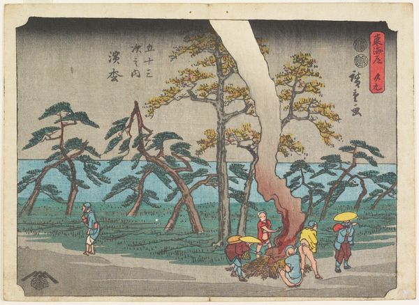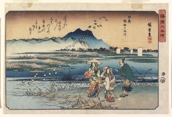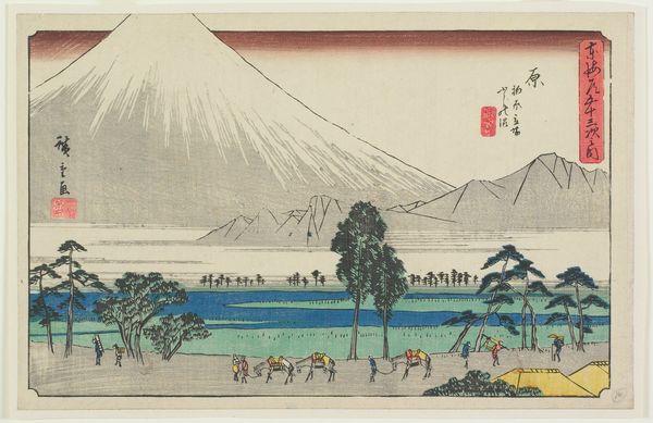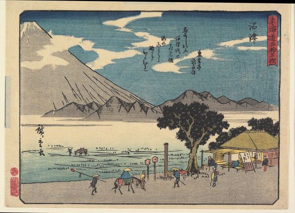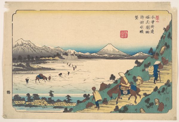 "Omiya", plate five from Keisai Eisen's series "Sixty-nine Stations of the Kiso Highway," offers us a window into 19th-century Japan, a society rigidly stratified yet vibrant with cultural exchange. The woodblock print captures a bustling scene along the Kiso Highway, a vital route connecting Edo, present day Tokyo, to Kyoto. Here, we see travelers from various social strata – peasants, merchants, and possibly even samurai – navigating the landscape. The visual emphasis on commoners in the landscape speaks to the cultural interest in representing the lives of ordinary people in the Edo period. Eisen, working within the artistic traditions of his time, subtly challenges the established norms of representation. How does the weight of their burdens – both literal and metaphorical – shape their journey and, by extension, the nation's story? This image invites us to consider not only the physical journey undertaken by the figures depicted, but also the broader societal currents that shaped their lives and movements. In capturing this particular moment in time, Eisen offers a meditation on the ever changing dynamics of Japanese society.