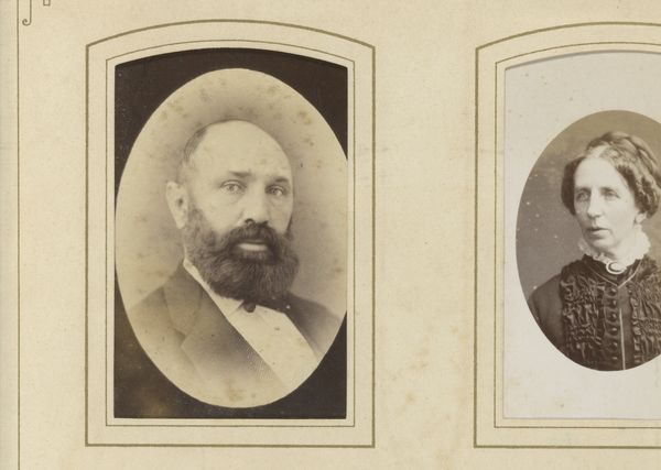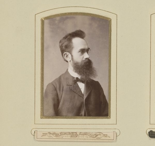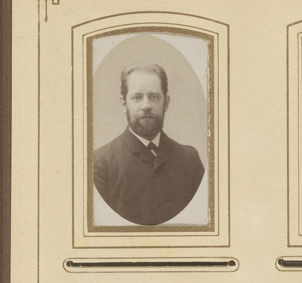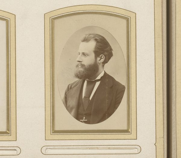Idanus Hendrikus Slaterus made this small portrait of a man with a moustache and beard in an unknown place and time. Photography during the nineteenth century served as a tool for social documentation and personal representation, though only for those who could afford it. The framing and composition, common in that era, reflect a desire to capture and preserve one’s likeness in a manner previously reserved for the wealthy who commissioned painted portraits. Here the man’s suit and tie, combined with his well-maintained facial hair, speaks to a certain level of middle-class respectability and adherence to social norms. Understanding this image fully requires us to look into the history of photography as a social practice: How did the rise of photography influence painting? Who had access to the medium, and what statements were they trying to make? Further research into archives might reveal the sitter's social position and political affiliations, adding layers of meaning to this simple portrait.