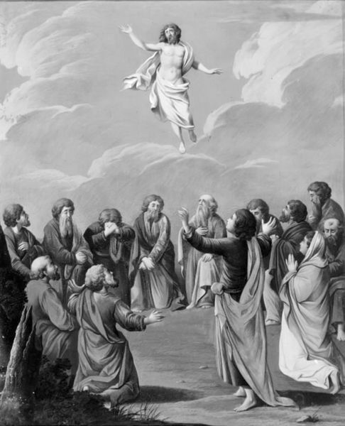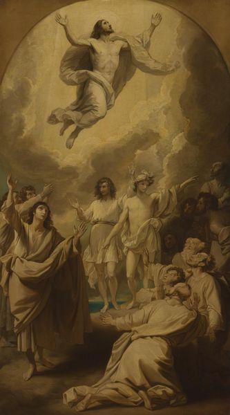 Curator: Here we have John Singleton Copley's "The Ascension," an oil painting from 1775. What strikes you about it initially? Editor: It's a classic depiction, bathed in light, almost saccharine in its presentation. The texture of the clouds, the upward gazes, the figures clustered below... there’s a definite theatricality at play. Curator: The theatricality is interesting. Consider the context of religious painting and its role in social power structures. Copley's representation engages with traditions of depicting divinity, but it also actively reinforces those very power dynamics. The whiteness of Christ and the angels, the upward directionality that implies hierarchy. These elements are far from neutral; they're politically loaded visual cues that contribute to the broader discourse around faith, authority, and colonial influence. Editor: Yes, but look at the pigment choices—that luminous, almost translucent layering in the sky. The ground is quite muted, earthy, made to seem quite ordinary in contrast with the heavenly scene. I wonder, what kind of brushwork would allow for that sense of ascent? What type of canvas? Did Copley prepare his own grounds, or rely on apprentices? The division emphasizes not just the spiritual and material realms, but also the techniques available and chosen at the time to portray the event. Curator: Those earthly tones root the scene in a very specific social and temporal reality. This "reality" is always mediated by gender, class, and race. Are the subjects rendered here truly representative? Who is missing, whose voices are silenced within this narrative? Whose labor allows for the procurement of those pigments in the first place? Editor: Right, thinking about that access and extraction… It would be interesting to know where Copley acquired his materials and from whom. These pigments aren't simply floating around. They are tied to material networks of trade, potentially exploitation, which undeniably inform how the divine is rendered here. Curator: Absolutely, and thinking through those networks exposes the power dynamics inherent in artistic production. It forces us to interrogate the layers of meaning embedded not only within the artwork itself, but within its very existence as a commodity circulating through specific social spheres. Editor: Thinking about both allows us to appreciate not just the skill and the final visual product, but also the very tangible conditions that made that image possible, along with all of its historical and cultural baggage. Curator: A powerful reminder that every brushstroke is interwoven with broader threads of historical, political and social meaning.