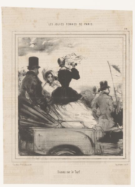 Editor: This is "The Straw Ride" from Harper's Bazar, an etching by Winslow Homer, dating back to 1869. The scene depicts a group of what seems to be wealthy individuals riding on a hay wagon. It’s the details in the subjects’ expressions and clothing that make it interesting. What do you make of it? Curator: It's fascinating to consider the social context of this image. Winslow Homer, while often celebrated for his landscapes and depictions of rural life, also engaged with representations of leisure and class. Note that this work appeared in Harper's Bazar, a popular magazine targeting middle- and upper-class women. Do you think that changes the context? Editor: Definitely. Knowing it was published in a fashion magazine gives a totally different meaning to their clothing, making them signifiers of the cultural elite. The landscape almost disappears. Curator: Precisely. And, within that socio-political structure, is this scene critical or celebratory of that class? The leisure activity suggests a romanticized view, doesn’t it? However, is there also perhaps a subtly observed social hierarchy even *within* the wagon? Look at how some figures dominate the scene while others seem more passively included. Editor: Good point. The women up front are clearly the focal point, and even among them, their attire signals distinctions, or aspiration perhaps, as does the contrast in status implied by those seated within the wagon, set against the rural backdrop. Curator: These carefully crafted class representations speak volumes about the intended audience and the magazine's role in shaping societal views. Thinking about how visual culture participates in reinforcing and also subtly questioning social structures opens a wealth of possibilities for interpretation, don’t you think? Editor: Absolutely. This helps unpack it more beyond just a group outing in a wagon of straw. It makes you consider the social dynamics at play and the role of publications like Harper's Bazar. I'll look at etchings in magazines much differently now. Curator: Exactly. Thinking about audience is paramount when unpacking any art or visual document, and the cultural function it performs!