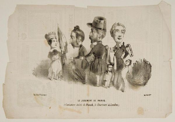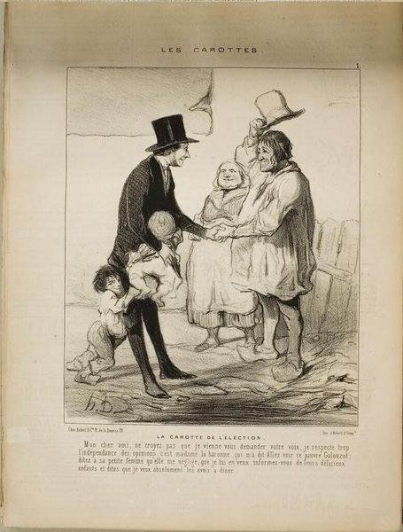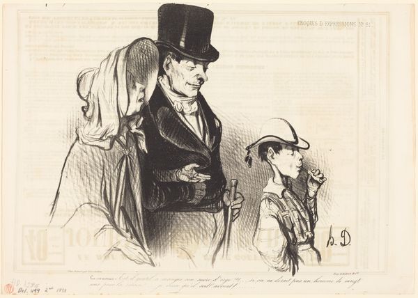 Curator: This is Honoré Daumier's lithograph, "The mother - 'Isn't he sweet eating his barley-sugar!'" from the 19th century. Editor: The stark contrast in lines is immediately striking; there’s almost a caricature-like quality to the figures. Curator: Daumier was a master of social commentary. This print, like many others, offers a glimpse into the dynamics of Parisian society and family ambition. Editor: Exactly. The almost severe lines around the father and the son eating barley-sugar create a sense of confinement, almost as if they're trapped in their roles. Curator: The mother's words, part of the lithograph's title, reveal her aspirations for the child to become a lawyer, reflecting middle-class desires for upward mobility. Editor: The simplicity of line, with its deliberate hatching, effectively captures the aspirations and anxieties of the era. Curator: Daumier's brilliance lies in his ability to encapsulate complex social realities within deceptively simple compositions. Editor: It's interesting how a minimalist approach allows us to see the social weight of the period reflected in the visual dynamic of the image.