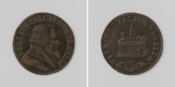 Curator: This striking bronze relief, made around 1552, immortalizes Charles V, the Holy Roman Emperor, and his son, Philip, heir to the Spanish throne. It is held here at the Rijksmuseum. Editor: There’s something deeply grave about the profiles chosen, especially in the limited space afforded by this circular medal. The patina and slight damage to the material actually enhance the gravitas, in my view. Curator: Indeed. The materiality speaks volumes. Bronze, a relatively humble material compared to gold or silver, suggests a dissemination strategy aimed at a wider audience. Medals like these were instruments of power. They circulated images, asserted dynastic continuity, and reminded people of imperial authority, even without immense wealth being displayed in its making. Editor: Looking closely at the forms themselves, the engraver demonstrated significant skill. Observe how light plays on the high relief of their faces and costumes. It subtly models their features, giving the portraits a life-like, three-dimensional quality, even on this miniature scale. Curator: And think about what is implied by depicting both father and son. We see an articulation of a carefully staged imperial narrative – ensuring a clear line of succession amidst religious and political upheaval. Consider the immense pressures of running such a large, fractured empire, and then think about the symbolic implications of being heir to this inheritance. The work certainly testifies to complex labor dynamics in Early Modern Europe Editor: Semiotically, Charles’ laurel wreath recalls the Caesars of antiquity, subtly associating him with the might of the Roman Empire, which held a powerful position during this part of history. Philip, although rendered with similar dignity, lacks that particular symbolic weight. Curator: The Italian Renaissance influences are also apparent in this object: the Classical revival, a growing awareness of human individuality, and an increasing use of representational portraiture as a tool for legitimizing and strengthening a patron's personal image. This work testifies not just to the importance of representing rulers but is more broadly illustrative of shifts in material production across European states during that moment. Editor: The artist managed to convey not only political power but also human complexity within a simple design. It’s an admirable encapsulation of the hopes and anxieties of a dynastic family in a moment of transition. Curator: A fascinating intersection of imperial image-making and artistic craft that tells many histories, right down to the touch and trade across Europe and artistic influences across that landscape.