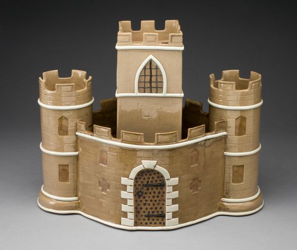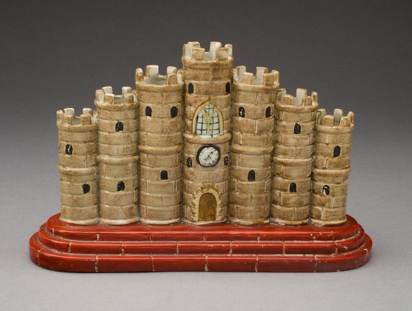 Editor: Right now we’re looking at “Giant in Tower” a mechanical bank made around 1892 by John Harper & Company. It's this whimsical little bronze sculpture that makes me think of a fairytale—but one with a slightly sinister edge. What strikes you when you look at it? Curator: It reminds me a little of childhood, you know? Like, the magic of saving. The patina of time adds this gorgeous layer of authenticity. Can you imagine the hands that lovingly placed their coins in this tower, dreaming of the day their pennies would turn into something bigger, brighter? Tell me, does that fierce-looking giant bother you? Editor: I hadn’t thought of it like that. I guess it's the spear he's holding that feels off to me. Like he's protecting the treasure *inside*. What sort of stories would people tell around this object? Curator: Perhaps they dreamt of valiant knights, fierce battles, and, naturally, untold riches! There's a darker side to all these mechanical banks though, and I think they can reflect some anxiety about banking practices during the Gilded Age. You see these charming objects are also commenting on anxieties about capitalism, security and who has access to what, or who guards what? The giant *is* rather intimidating... Editor: I get that! I initially saw a fairy tale object and it is, but I never considered the social messaging and complexities behind children's banking items in the 19th century! Curator: See? Art does this little thing – reflects the mundane and the sublime, side by side. Like this quirky giant with his hidden tower of dreams, this piece asks, 'what will you protect, and what might you sacrifice, in pursuit of treasure? ' It is more of a question for the little savers of today than you think!
