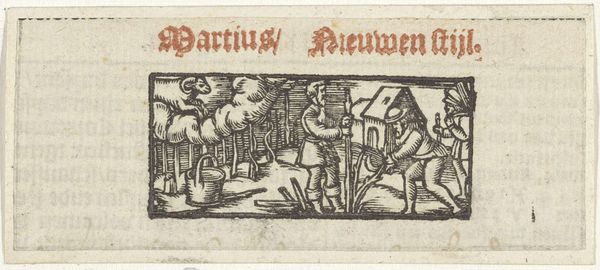 Curator: What a charming little scene! This is a woodcut print entitled "Maart", or March, by Dirck de Bray, created sometime between 1635 and 1694. Editor: It’s simple but evocative. There's a strange stillness to the image that gives it a somewhat melancholy tone, like the end of something rather than a vibrant beginning associated with Spring. Curator: The rough hewn quality certainly lends itself to a rustic interpretation. The medium is important to consider, because it reveals that such prints were a fundamental tool for distributing information. Editor: Information such as? Curator: Well, given the title "Maart", and its depiction of rural life, I'd wager it relates to the agricultural calendar or perhaps local weather patterns—important information to be available in every household, in the 17th Century Netherlands. This artwork shows the function that museums played in circulating imagery and standardizing local culture. Editor: Yes, but note the prominent sheep in the print, seemingly untroubled. It raises questions about access to resources, and the availability of materials in that historical setting. And what are we to make of that boy? Does he belong to the sheep? Does he own it? Was he enslaved in the 17th Century Netherlands? There is a world of socio-political interpretation at play in this piece of work. Curator: It’s definitely ripe for interpretation. Looking again at the landscape elements: the roughly sketched farmhouse, the horizon line… these create a certain vision of Dutch national identity tied to the land, circulating among households in printed form. Editor: I see your point. Even a seemingly simple print like this becomes a vessel for cultural values, expressed through the wood and ink from which it's made, and then shaped and re-shaped as those who used and continue to use these very materials that form culture as we know it! Curator: Exactly! I think looking at it today we can understand a bit better how art helps us find out what history is really made of. Editor: Agreed. Art pieces are just one way of piecing the complex and compelling nature of Dutch art history.
