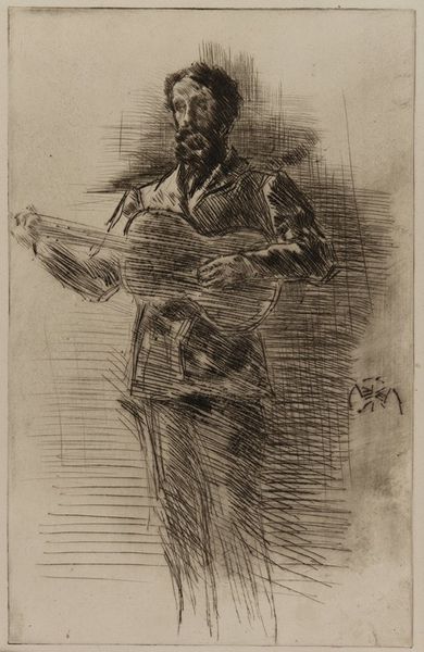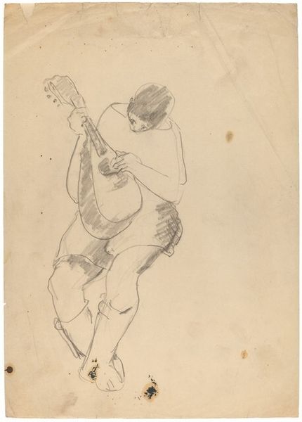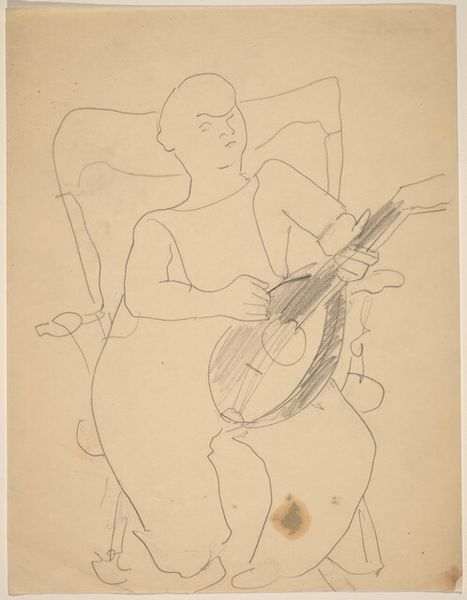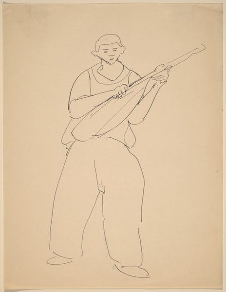 Curator: Rothko? That's… different. The gallery is showing a little-seen drawing called "Figure Playing a Lute." It's, well, sparse. Editor: My first thought? Intimate. There's a quiet intensity about this simple ink drawing. A lute player caught in a private moment, almost hunched over their instrument, absorbed in melody. You can feel the stillness, almost hear the music that is suggested in the work. Curator: Sparse is…diplomatic. It’s more like Rothko did a doodle during a very boring phone call. There's a beautiful sense of uncertainty, wouldn’t you agree? Like he's only *sort of* decided on what this lute player even *is*. The face! There is no face! It’s incredibly funny in its awkwardness. Editor: Perhaps the face is internal, an expression of concentration on the instrument? There’s a power in this absence. Think about the act of viewing: without prescribed identity we are invited to project, or to remember what a musician’s world looks like when it involves deep and utter immersion in one’s practice. We need not look further than marginalized groups, where such work ethic and dedication goes unnoticed or unacknowledged in Western spheres. In a space for memory, perhaps we’ve found more universality than we anticipated. Curator: True, that space for projection. I dig that! He leaves space. Like, “Hey, YOU figure out who this person is and what they mean!” I’m wondering though, did Rothko even *like* music? Maybe he just liked the *idea* of music. The drawing is more about form and suggestion than any accurate depiction of an instrument or a person, it's kind of punk rock! Editor: And that rebellion against the aesthetic norms of figuration perhaps speaks to a broader societal tension. It is worth thinking, too, about what role visual minimalism, broadly, has played in different communities or sub-groups whose voices historically remain outside institutional dialogue. It’s like refusing the visual opulence of the ruling classes or Western fine art. A visual stripping-away feels powerful here. Curator: See? This awkward doodle made you go sociological! Editor: Well, maybe your "doodle" has unlocked something.