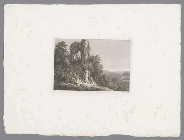 Curator: Here we have Philipp Veith's "Landschap met overwoekerde ruïne nabij Rome," or "Landscape with overgrown ruins near Rome," an etching and engraving executed around 1822. It is rendered primarily in monochrome. What springs to mind as you observe the composition? Editor: It feels wistful, almost melancholic. The delicate lines create a scene both beautiful and a little forlorn, like nature slowly reclaiming something grand and imposing. There is the ruin of some architecture on the right that is gradually becoming overtaken with shrubbery. Curator: Indeed. The ruin, while substantial, becomes part of the broader landscape through compositional techniques: the integration of the ruin with the organic is a structural mirroring between hard and soft lines. A symbiosis, if you will. Editor: I love the way Veith uses the etching to create depth. The foreground is quite detailed, with a real sense of texture, then everything softens into this hazy, dreamlike background. The composition directs you toward the distant hills but with multiple visual pathways that provide several means to enjoy the art, as the details in the landscape also engage your curiosity. Curator: The execution showcases an intersection of Romantic and Neoclassical influences, visible in the subject matter – the evocative ruin – coupled with the ordered linearity in the etching style and perspectival arrangement. This allows for historical and philosophical contemplations. Editor: Absolutely! I think about time. Not just the history of the building in the scene, but our own fleeting moment, too. Like, what mark will *we* leave, or will it be something else that returns us to our source like a snake eating its tail. Also, on a formal level, do you find something particularly inviting or intriguing? Curator: Formally, the layering in the landscape presents an ideal tension of receding planes and stark linearity, something that I enjoy about neoclassical approaches when representing space. Editor: Yes, lovely. Ultimately, it is this blend of the sublime with the meticulous, the fleeting with the permanent, that resonates so powerfully. Curator: A convergence meticulously rendered by Veith through precise lines and calculated spatial depth. A perfect encapsulation.
