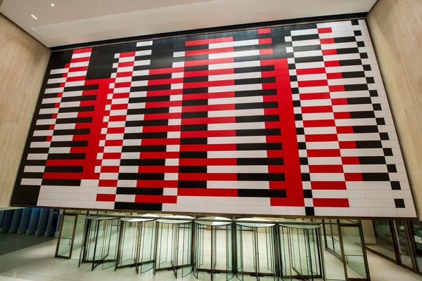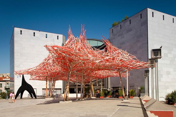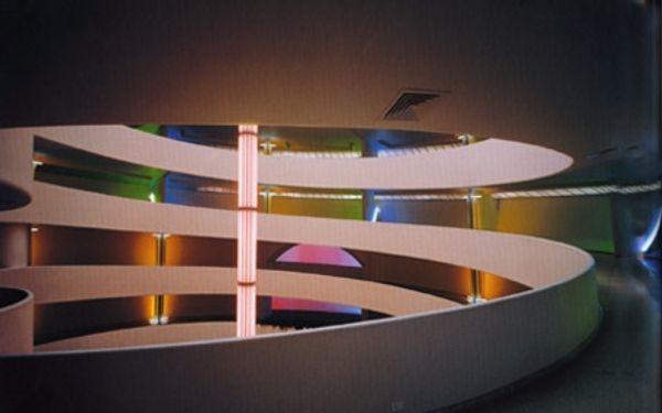 Editor: So, this is Anish Kapoor's "Marsyas," from 2002, a striking site-specific installation. The scale of it is immense, almost overwhelming! It completely transforms the space. What strikes you most about its formal qualities? Curator: The immediate visual impact stems from its vibrant color and the tension inherent in its form. Note how Kapoor utilizes the existing architecture. The elongated lobes, seemingly stretched between the building’s supports, create a powerful sense of compression and release. What is your take on this, viewed from a purely structuralist perspective? Editor: I find the curves very intriguing. There is a dichotomy here, between organic, almost visceral shapes and its sharp lines—that blend with its artificial production of mixed-media material. Are there, or is it more than, just geometric considerations at play in shaping "Marsyas?" Curator: Geometric certainly. It relies heavily on semiotics to generate meaning. Consider how the title, “Marsyas,” alludes to the flaying of the mythological figure. This work visually references that act through its form and color. The fabric appears taut, stretched, and almost violated, suggesting a raw and exposed interior. Can we decode its philosophical nature in more depth, or perhaps compare/contrast Kapoor’s body of art with other modernist giants? Editor: The red color becomes incredibly poignant when you interpret it through the lens of its mythological reference. Its sheer monumentality dwarfs the audience in a bodily experience. What have you learned here today, then? Curator: Considering it solely through form helps appreciate how Kapoor can engage in abstraction as a reference for bodily horror, without representational figures.