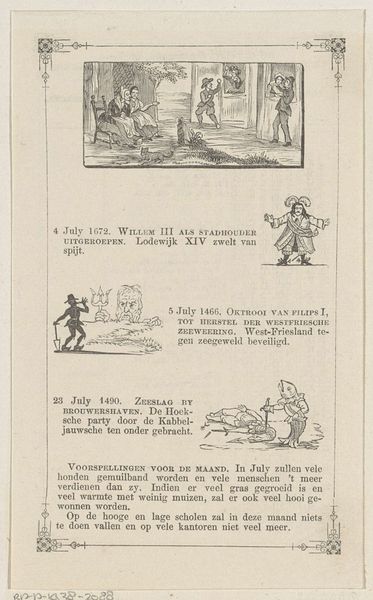 This print, made by Friedrich Robert Prinz, likely around 1849, presents us with symbolic images that speak volumes about the past and anxieties of the time. At the top, we see a vignette of figures on a frozen landscape, one pulling the other on a sled. This evokes themes of labor, support, and perhaps the burdens one carries for another. The frozen pond connects to the text below about the winter of 1849, in which Amsterdam froze over. Below it are small scenes of men posturing together. Consider the Munstersche Vrede, where figures toast one another in apparent agreement. This symbolic gesture has appeared across time in Roman coins and medieval tapestries and continues to be seen even in modern political cartoons, illustrating the cyclical nature of historical motifs. These motifs echo through time, revealing how collective memory and subconscious processes affect the production and interpretation of symbols. The emotional weight of this image resonates deeply, engaging viewers on a subconscious level with powerful historical and cultural memories.