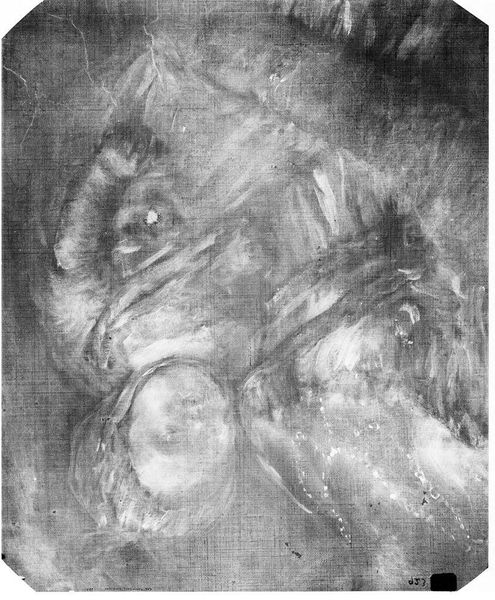Editor: This is an X-radiograph of Titian's "Judith with the Head of Holofernes," held at the Harvard Art Museums. Seeing this image, I’m struck by its starkness. What does this x-ray reveal to you about the artwork's story? Curator: It’s compelling, isn't it? This x-ray unveils not just the underpainting, but also speaks to the act of seeing, of looking beneath surfaces. Considering Judith’s defiance against patriarchal violence, does this radiographic gaze offer a modern parallel to her unveiling of power structures? Editor: That's such a powerful way to frame it! It definitely adds another layer to my understanding. Curator: Indeed. Hopefully it offers insight into the intricate dialogues between art, power, and interpretation.