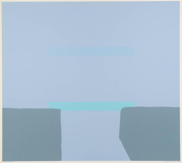 Curator: This is "6. Sheet A" by Gerd Winner, currently part of the Tate Collections. The image is roughly 60 by 60 centimeters. What's your first impression? Editor: Bleak, almost post-apocalyptic. The muted tones and stark geometric shapes give off a very cold vibe. It’s as if a city street has been reduced to its barest essence. Curator: Winner's work often explores urban landscapes. I think here the buildings are simplified to these looming blocks, and the yellow lines become almost abstract bands of color. It reminds me a little of Hopper, but less romantic, more… detached. Editor: Absolutely. The lack of detail, the absence of human figures, it all points to a sense of alienation. It’s not just a street; it’s a symbol of urban isolation. I wonder what it felt like to create it. Curator: Probably a way to explore the emotions, like that feeling of being overwhelmed, that those empty streets often cause. Editor: Well, for me, it definitely evokes a moment of quiet reflection on modern life.