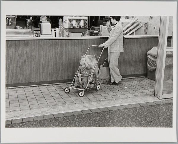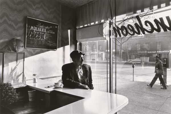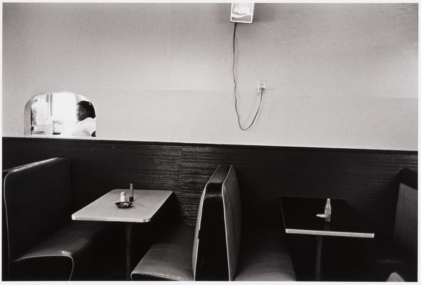 Curator: Welcome. We're standing before Jim Goldberg's gelatin-silver print, "Orphans of the Road," believed to have been created between 1990 and 1994. Editor: It's stark, almost confrontational, isn’t it? The deep blacks dominate. I feel a strong sense of social distance and the figures become anonymous in some way. Curator: Indeed. Goldberg is known for shedding light on marginalized communities. The high contrast here casts long shadows. We see individuals, primarily silhouettes, within what looks like a fast-food restaurant, separated by counters and light. The black and white emphasizes a documentary style. Editor: Absolutely. The scene is framed in such a way as to create visual tension. The shadowed figures in the foreground look to be staring across the space to the activity at the counter. The architecture further enhances the sense of isolation; everything feels incredibly functional. Curator: Goldberg often blends documentary and staged elements in his work to reveal socio-economic realities. This work encapsulates ideas of economic precarity as social alienation through the figures' anonymity. One almost feels transported to an Edward Hopper painting, but with a contemporary lens. Editor: This tension and precarity can really tell a larger narrative, like an archive of emotions that relates not just to the immediate lives of the subjects represented but perhaps a wider cross-section of the American populace in that era. Goldberg captures moments of urban living. Curator: And the ‘Orphans’ in the title speaks volumes, especially given Goldberg’s interest in at-risk youth at this time. In seeing the subjects consuming something within this casual restaurant as an act of momentary respite within harsh external conditions. Food becomes the simple momentary shared activity. Editor: Right, the title casts a long shadow too. The ‘orphans’ implies vulnerability, perhaps a loss of traditional support structures and in a time when there has been massive socioeconomic disruption. I like how the photo makes me question: who exactly are the ‘orphans’ in this frame? And what systems have failed them? Curator: The print's enduring power lies in its ambiguity. There isn’t a neatly wrapped moral in this black and white rectangle. Editor: A powerful meditation on poverty, social disconnect, and our shared humanity, prompting further reflections.