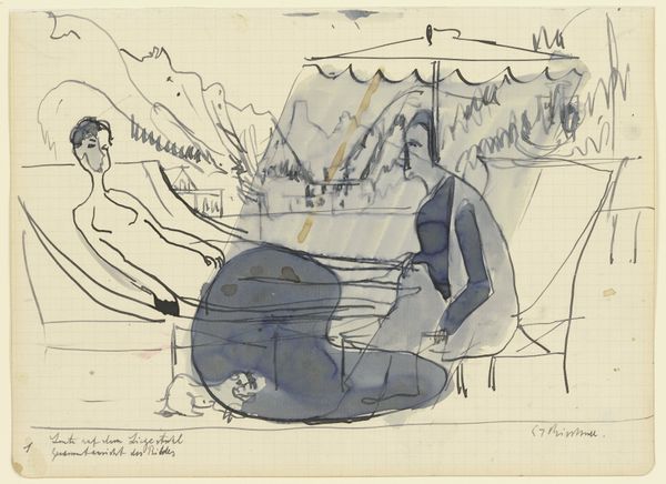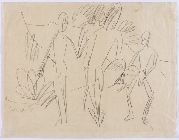 Curator: This is Ernst Ludwig Kirchner's "Archers," dating from around 1935, held here at the Städel Museum. It’s a compelling piece done in ink, pencil, and chalk. Editor: Immediately, I’m struck by the dynamism. The figures seem to surge across the page, despite the rather muted color palette. Curator: Indeed. The work's creation coincided with a period of increasing artistic and personal struggle for Kirchner. The Nazi regime had declared his work "degenerate," leading to the removal of his art from German museums and a ban on exhibiting. Editor: That tension bleeds into the frenetic energy of the piece. Look at how the ink outlines practically vibrate around the more solid chalk figures. There’s a real sense of unease and perhaps resistance. Curator: Precisely. His artistic circle and the landscapes of the Swiss Alps became essential to his survival. This work, featuring the theme of hunting and primal skills, could represent a turning inward, a finding of strength in an imagined, perhaps romanticized, past, amidst persecution. Editor: The composition guides the eye from left to right—from the more loosely sketched figures in the background to the foreground where the forms become dense. It almost feels like the piece visually breathes, inhaling and exhaling the drama of these figures engaged in their hunt. Curator: Also note the historical context for such figures in Kirchner’s work, his invocation of earlier modernist Primitivism or what he called his “hieroglyphs”, how his compositions created his unique visual style of conveying complex narratives of people and their cultures through form. Editor: This makes sense of the way we can decode these people and objects, and their interrelations: an analysis based on his construction of a unique artistic language. Curator: Yes, the political anxieties of the period infuse the scene with greater import and allow one to truly comprehend Kirchner's vision in this work. Editor: Ultimately, I think “Archers” resonates as an assertion of resilience. It offers a space of dynamic freedom crafted through deliberate formal strategies, that make this a compelling artwork by Kirchner.