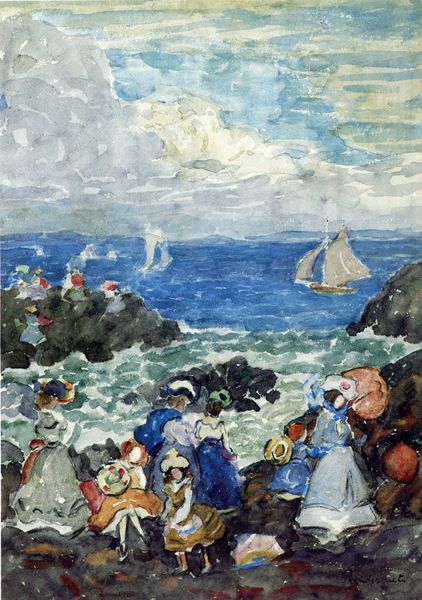 Maurice Prendergast painted this small watercolor, *Nantasket*, with a playful spirit, letting the medium run and bloom across the page. It’s a process of controlled chaos, where the vibrancy of the colours and the looseness of the marks create a feeling of spontaneity. Look at how he lets the figures emerge from the rocks and the sea. The watercolor bleeds into soft edges and dappled light, and this makes me think about how our memories soften over time. You can almost feel the breeze, and see the movement of the crowds enjoying a day out. I love the way he captures the energy of the beach with such simple, translucent strokes. There’s something very modern in the way he’s able to flatten perspective, it reminds me of Bonnard or Vuillard, who also used these techniques to make intimate, domestic paintings. It shows how painting is an ongoing conversation, isn't it?