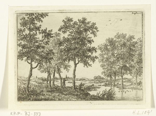 This etching, "Het kleine schiereiland," by Simon de Vlieger presents a serene landscape, dominated by trees reflected in calm water. Trees, universal symbols of life, growth, and connection between earth and sky, evoke our deep-seated reverence for nature. The emphasis on foliage resonates with the ancient "arbor vitae"—the tree of life—motif, which appears in various cultures from the Assyrians to the Kabbalists. As seen in illuminated manuscripts, this symbol often represented spiritual immortality. In contrast, the barren branches of other trees invoke themes of mortality and the cyclical nature of life. Consider how the stark, leafless trees also appear in funerary art, symbolizing mourning. De Vlieger, perhaps unconsciously, taps into this collective memory. He presents us not just with nature, but with the emotional weight of existence itself. The interplay of light and shadow further enhances this psychological landscape, engaging viewers on a subconscious level. Such symbols have continued to evolve, resurfacing in art and culture across the ages.