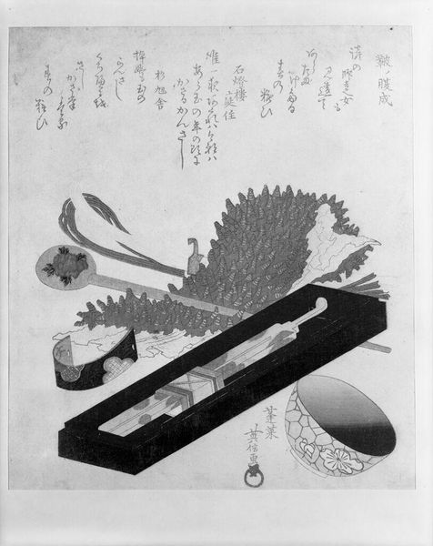 Curator: Katsushika Hokusai's Fan and Jardiniere presents a meticulously rendered still life, showcasing his mastery of line and form. The composition is structured around the contrast between the geometric jardiniere and the circular fan. Editor: It strikes me as quite meditative, almost austere. The limited palette really directs your focus to the narrative elements within the fan itself. Curator: The linear arrangement of the tall grasses complements the decorative patterns on the jardiniere, creating a visual harmony. Note also how the calligraphic elements balance the overall design. Editor: Beyond the formal elements, this work feels imbued with a sense of societal commentary. The depicted fan scene hints at everyday life, perhaps referencing the restrictive gender roles of the time. Curator: A valid point. However, I am compelled by Hokusai’s acute attention to spatial relationships and texture. Editor: Ultimately, it’s a work that invites us to consider both the aesthetic and social dimensions, prompting a broader understanding of Japanese culture.