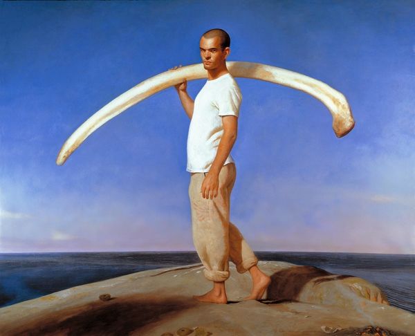 Curator: Today we're examining "Landscape with an Archer" by David Ligare, created in 1991. A truly compelling piece of figuration set en plein air. Editor: Striking! My first impression is the incredible contrast. The idyllic pastoral scene in the background meets this… idealized yet earthly figure in the foreground. Curator: Indeed. Ligare's application of realism is technically proficient. Observe the calculated arrangement—the figure drawing our eye upwards. The verticality of the composition culminates in that perfectly rendered arrow. It seems as if the image wants us to consider notions of aim and aspiration. Editor: The material engagement is interesting, too. Ligare chooses to paint outside, a technique which brings its own set of challenges regarding time and environmental conditions. This process inherently roots the "high art" of figure painting in the very material, geographical context of its making, dissolving the hierarchical divide, if you will. What kind of paints do you suppose he used, and where did he source his canvas? Curator: Certainly, these contextual considerations are valid and shape interpretations. Yet, let's consider how the landscape itself functions. It's more than mere backdrop. Note how the sinuous curves of the river echo the archer's bow, reinforcing a visual theme. We observe a synthesis between the human and the natural worlds, brought about by meticulous planning of every line and shade, thus offering something beyond materiality. Editor: But that synthesis depends on specific social and economic structures! Who is afforded the time and resources to produce artwork en plein air like this? By whose labor was his canvas woven and prepared? Ligare's image may intend some universality of man with nature, but his reality of producing this "universal" vision must be understood. Curator: A powerful point, underscoring the intersection between artistic vision and production practices. As a composition, this is all rendered skillfully within established conventions. Ligare is an adroit image-maker. Editor: It gives a lot to consider... and definitely asks more questions the deeper we get into the image. Curator: Absolutely. I believe this will offer all our guests an enriching perspective.
