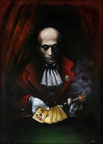 Editor: Here we have Scott Gustafson's "The Consulting Detective," rendered in oil paint. The sitter's piercing gaze and clasped hands create an atmosphere of intense concentration. What aspects of the painting stand out to you most? Curator: Immediately, the strong symmetry commands attention. The figure is rigidly centered, almost bisected, creating a visual order that underpins the portrayal of intellectual control. Do you notice how the red of the chair is echoed in the cufflinks and tie, acting as a focal point that pulls the viewer into the composition? Editor: Yes, that deliberate repetition of color is very effective. It certainly unifies the composition. What about the shadows? They seem to soften what could have been a harsher, more realistic portrayal. Curator: Precisely. Note the chiaroscuro effect. It softens the planes of the face, imbuing it with a gentle light. In a painting of this sort, every deliberate distortion or modification, down to the subtlest gradations of tone, is a choice by the artist affecting its reception by the viewer. Observe the crisp, almost mathematical forms which, although somewhat diminished in scale, nonetheless echo his intellectual intensity. The color red acts a powerful component adding warmth and, perhaps, reflecting the detective’s inner passion beneath his placid surface. Editor: So, the interplay of formal elements – the symmetry, the color, the lighting – are essential to understanding the portrait? Curator: Absolutely. Gustafson uses these tools with a sharp, analytical approach, highlighting intellectual rigor above pure imitation. The detective's form is used for, and enhances, this portrait. Editor: I see how the formal elements contribute to the feeling of deep contemplation and intellect that the artwork projects!
