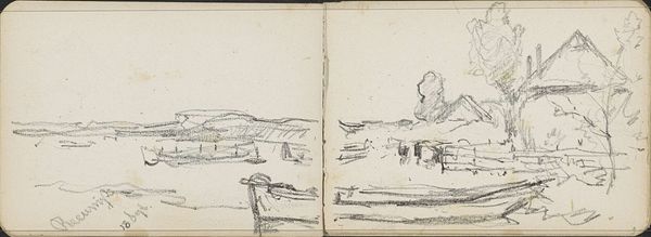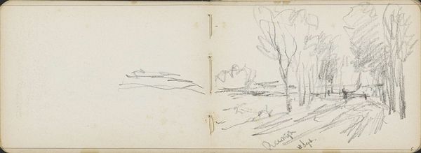 Curator: This is "Landschap met bomen aan een waterkant," or "Landscape with Trees by a Waterside," a pencil drawing by Willem Cornelis Rip. He likely created it sometime between 1866 and 1922. Editor: It feels like a whisper of a place. Ephemeral, you know? As if the whole scene could dissolve back into the paper any second. Very serene, almost haunting in its simplicity. Curator: I think that’s fitting. The pencil medium contributes to the sense of it being a fleeting moment, quickly captured. Look at how he uses the different weights of the lines to suggest depth. Notice the horizon and its relation with the symbol of water that, through the ages, appears linked to temporality and reflection. Editor: It's the trees for me. They are not just trees; each one looks like it holds a secret, almost as if each were a guardian or a witness. The composition uses them as visual anchors that carry the gaze to the unknown on the other shore. Curator: Right, and beyond the realism—the observable details of the landscape—the artist's inner state projects the archetypical relationship with nature and our subconscious yearning to return. It is, as some analysts suggest, a symbol of nostalgia and a longing to go back to nature. Editor: Nostalgia, yeah. There is a faint dream quality that pulls at you. It feels like a memory resurfacing rather than a snapshot of a real location, perhaps like seeing something not quite present but more real somehow. Curator: What is so potent, then, about its timeless symbolism of landscapes? Could its endurance speak to our collective ancestral relationship? I imagine Rip would like to be interpreted this way: finding and displaying emotional impact from simplicity. Editor: Definitely simple on the surface, yet resonant underneath, like one of those perfectly imperfect Zen gardens, inviting contemplation... I could just get lost here. Curator: A perfect little place to linger and contemplate. Editor: Indeed, a humble sketch turned window into a wider, deeper view.