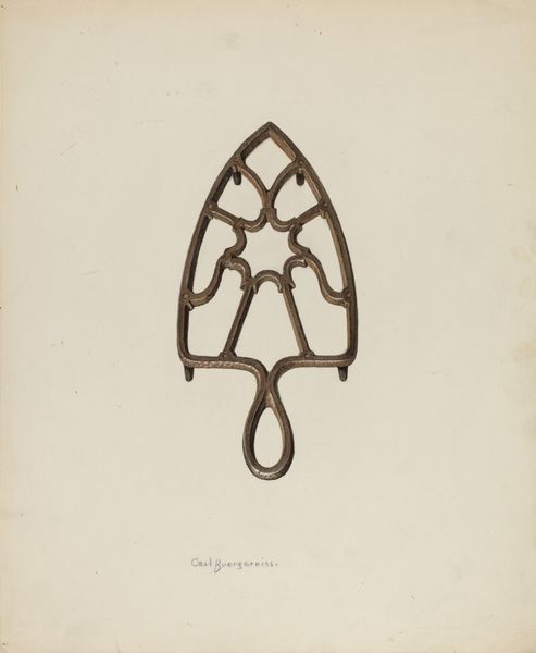 Editor: This drawing, called "Trivet" by Ardella Watkins, dates to around 1942 and is made with pencil and graphite. It's so detailed and realistic. What strikes you when you look at it? Curator: It's interesting how Watkins chose to depict such a mundane object. We should consider the material realities here. A trivet exists to protect surfaces from heat – a practical tool of domestic labor. Editor: So, you see it as a commentary on domestic work? Curator: Not just that, but on the materials and processes behind the trivet itself. Someone designed and produced this object. Watkins, in turn, renders that labor in her own way, with graphite. There's a chain of production, isn't there? Think of where the materials come from for each stage: the trivet, the graphite. How labor-intensive these stages may or may not be. The value is interesting. What do you think she is trying to convey? Editor: I suppose she’s drawing attention to the unseen labor that supports our everyday lives. It makes me wonder who designed the original trivet and how mass production affects artistic value. Is the drawing worth more than the trivet itself? Curator: Exactly. We elevate the "art" but often ignore the design and manufacturing involved in even simple, functional items. Editor: I never considered looking at art this way! Thinking about the labor and material history adds a whole new layer to something as simple as a trivet drawing. Curator: Indeed. It forces us to question the boundaries between art, craft, and industry. The making of the trivet, the means through which Watkins then renders it. A reflection of all labor and design processes, from its physical making, all the way through this moment.