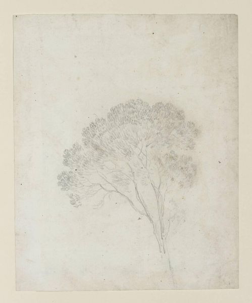 Curator: The very subtle tonalities create such a mysterious aura here. Editor: Indeed. We’re looking at "Boomvaren," or "Tree Fern," a pencil drawing from somewhere between 1816 and 1846 by Adrianus Johannes Bik, housed here at the Rijksmuseum. There is a ghostly quality to it. The main subject is clearly defined, but behind, we get a paler vision of another one. Curator: Yes, the repetition almost reminds me of a cultural understanding of how memory functions. The brighter object could stand for present experience, the faded one, for a long-gone memory or reflection that stays with us nonetheless. Editor: That's fascinating. It certainly resonates with the Romantic period's fascination with nature, but also with its use of imagery and representations of nature as containers for human emotion. Was this artist part of the institutionalized art world or an outsider exploring a scientific passion perhaps? Curator: Given the scientific, detailed rendering, this evokes associations with botanical illustration, and perhaps signals a relationship with Enlightenment thinking about scientific discovery that then transforms into Romanticism’s emotional and psychological inquiries. I mean, note the painstaking way he depicts the unfurling fronds. Editor: You are right. The drawing blends an interest in capturing the specifics of the fern while imbuing it with this almost ethereal presence. The lone plant set against that expansive negative space makes it symbolic. It begs questions about mankind's relationship to nature during a time of great societal transformation. Is the artist trying to depict our human imprint on the natural world, and perhaps our helplessness in front of its power? Curator: I also feel a certain tension stemming from the pencil as a medium itself, often used for sketches, studies. But here it's used for a detailed work in itself. I would almost see the artist portraying human existence with his fragile choice of material. Editor: Ultimately, this drawing invites us to see beyond just a botanical depiction. Bik captured not just the tree fern but its essence, hinting at broader concerns that shape the human condition, our fears and the questions we constantly ask about life on earth. Curator: Yes, the quiet observation speaks volumes across the ages. A meditation.