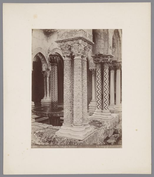 Curator: This gelatin silver print, titled "Zuilen in de kloostergang van de kathedraal van Monreale, Italië," was taken by Giorgio Sommer between 1857 and 1914. It presents a fascinating visual record of the cathedral's cloisters. Editor: It’s immediately striking how the composition emphasizes the textured surfaces. The grainy silver print almost exaggerates the relief work on those columns. You can almost feel the stone. Curator: Indeed. And those cloisters, built in the late 12th century, were themselves designed as powerful declarations of Norman Sicilian power, marrying diverse cultural influences. Sommer was very interested in ancient styles. Editor: Absolutely. Look at the level of detail captured here, think about the labor involved in creating the physical columns initially! We’re seeing the results of both medieval stonework and 19th-century photographic processes. How does the interplay between labor across centuries reshape how we view these ancient columns? Curator: A compelling point! The photographic process allows Sommer to present this specific view to a wider audience, transforming a somewhat private architectural space into something much more public and readily available. It shapes perceptions, solidifies the monument's legacy. Editor: I also keep coming back to materiality: the rough, earthy quality of the stone versus the smooth finish we might expect from later, mass-produced materials. You can really see the individual workmanship in each column. Curator: The repetitive geometric and floral motifs evoke ideas of paradise and religious devotion, especially given their setting in a cathedral cloister. Editor: I agree, the detail feels quite rich for what would otherwise be a simple support structure. The level of artisanal production becomes elevated when the columns become an integral part of this cathedral. It speaks volumes about the societal role this artwork was intended to hold. Curator: This work is powerful evidence of the ways in which images like this reinforce historical narratives. And its reproduction grants accessibility for public audiences. Editor: Precisely! I've learned so much about how deeply human creation influences something that may first appear only "historical" or "old." Thank you.