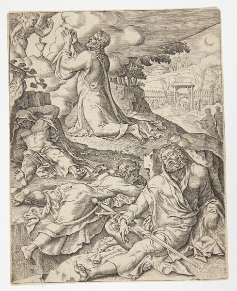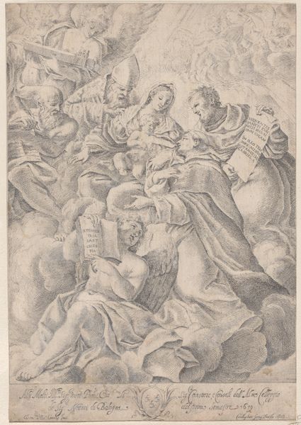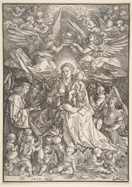 Curator: The sheer density of detail hits you right away, doesn’t it? All those angels practically spilling out of the frame! Editor: It's wonderfully overwhelming! Like peering into a kaleidoscope made of faith. What exactly are we looking at here? Curator: This engraving, entitled "The Virgin Surrounded by Many Angels", dates back to the 16th century and is attributed to Ferrando Bertelli. The print showcases the Virgin Mary with the infant Jesus, surrounded by a heavenly host. Editor: The technique is remarkable. Considering this work of art as a print emphasizes the historical proliferation of religious imagery. Bertelli was clearly making this divine vision accessible. But looking closer...the figures feel slightly stiff, don't they? More like decorations than beings brimming with life. Curator: I see what you mean. Perhaps the formal style was a conscious choice reflecting the idealized representation of religious figures common during the Renaissance. It is a testament to Bertelli's skills. There's a clear hierarchy – all eyes are drawn to the calm stillness of Mary holding her child, with the bustle and flutter of angels around her adding to that central calm. What do you think of this choice? Editor: Interesting point. To me, the figures in motion emphasize a rigid societal structure where every gesture had a meaning and served its precise function within religious rituals. Did that impact how the audience experienced this visual rhetoric back then, do you think? Curator: I imagine so. It would serve not only as a spiritual object but also a powerful signifier of social values and religious order, as the church influenced various facets of Renaissance society and life. And I cannot overlook how, even in this relatively small-scale print, the image seems monumental, the story of immense proportion. Editor: Yes, it makes me ponder on accessibility. Religious imagery, once confined, now made more broadly available thanks to the printing press. So this small print, like many others, functioned almost like a visual sermon in people’s homes, reminding them daily of faith and, of course, the church’s immense power. A small print with such big ambitions, one could say. Curator: Precisely! Bertelli successfully captured the Renaissance ideals of beauty, order, and piety within this captivating image, even within the stricter framework of social functions and historical accessibility you bring up. Thank you, I think I see new depths to it now! Editor: My pleasure!