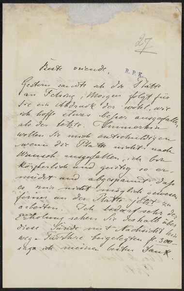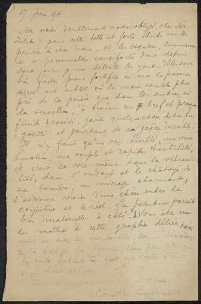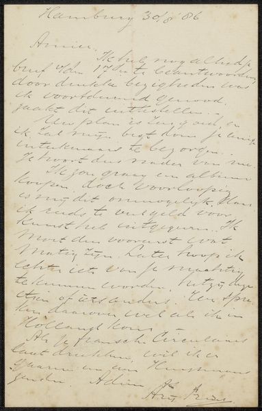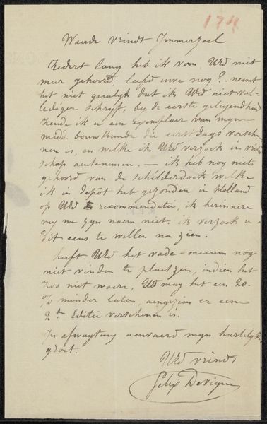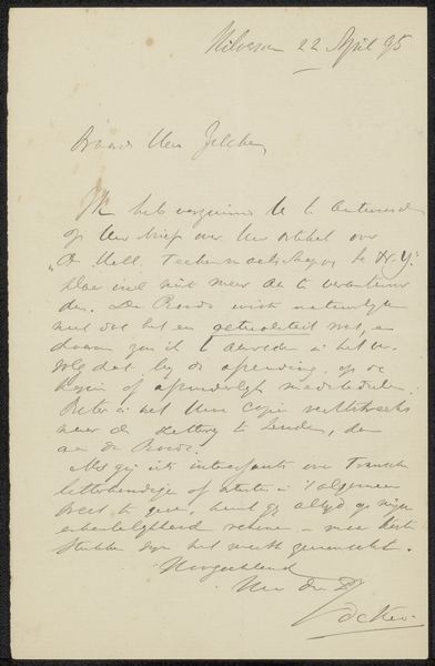 Curator: Today, we're looking at "Brief aan Philip Zilcken," a drawing possibly from 1892, created by Cornelis Willem Hendrik Verster van Wulverhorst, rendered with pen and ink on paper. Editor: It feels very immediate, like a fleeting thought captured on paper. How would you interpret the visual elements of this piece? Curator: I observe a focus less on mimetic representation and more on the graphic qualities inherent in the artist's choices of line and form. Consider the calligraphic variations: are they simply a functional transcription, or is there an evident aesthetic decision-making process occurring within the arrangement of letterforms and spatial organization on the page? Editor: That’s interesting. So you’re suggesting that the act of writing itself, the visual quality of the handwriting, is what we should be paying attention to. Curator: Precisely. Notice the tonal variations within the ink itself and how it impacts the page’s perceived depth of field. Further analyze how Verster's deployment of positive and negative spaces influences compositional equilibrium; does his layout offer structured harmony or, contrarily, create deliberately intended disjunction within that optical framework? Editor: It's a fresh way of engaging with what seems like a document at first glance. Now I see the textures and the interplay of light created just by the ink itself. Curator: By moving beyond simply deciphering the text, we are better equipped to interpret its purely visual aesthetic value. Editor: It's interesting how shifting our focus to formal elements allows us to unearth details and find beauty in something we could easily have passed over.
