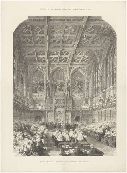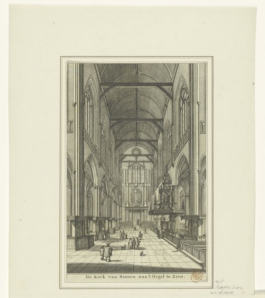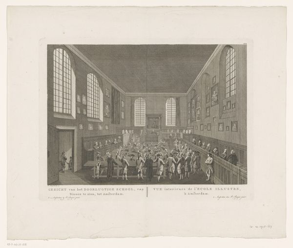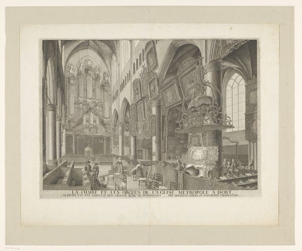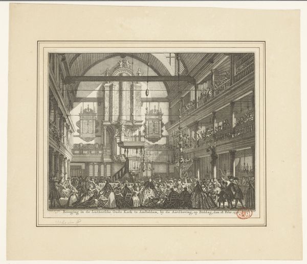 Editor: So, this is Jan Caspar Philips's engraving, "Synode gehouden in de Nieuwe Kerk te Amsterdam, 1730", dating from around 1738-1739. It's incredibly detailed! What really strikes me is the sheer number of people depicted and how they’re positioned within this grand architectural space. How would you approach understanding a work like this? Curator: Well, considering the synod itself, we need to think about production here: The Reformation had a profound effect on the socio-economic landscape of Europe and how labor was organised around new models of faith and governance. A highly detailed engraving like this demonstrates skilled artisanship, but also indicates access to resources, patronage, and a sophisticated system of print distribution. Editor: Right, the production process! The act of engraving itself—transforming an event into a reproducible image. Curator: Precisely. What's important is thinking about access, as these prints, circulated broadly, disseminating information, constructing specific narratives and establishing hierarchies. What does this make you consider about how prints like this served as a medium to establish a particular cultural viewpoint or system? Editor: That it provided access and enforced control; it created awareness but also served as political device for circulating information to the wider world. This print, as an artifact, highlights the distribution of religious power through materials and its own method of production. Curator: Indeed. Considering the social implications bound within materiality of print and its content lets us start to uncover a nuanced discussion around cultural influence, commercial ambition and community identity in 18th-century Amsterdam. Editor: So, seeing it as more than just a historical record opens it up to understanding social and political landscapes as being bound by materials. I see what you mean now. Thank you. Curator: Absolutely. There is power in process and material culture.
