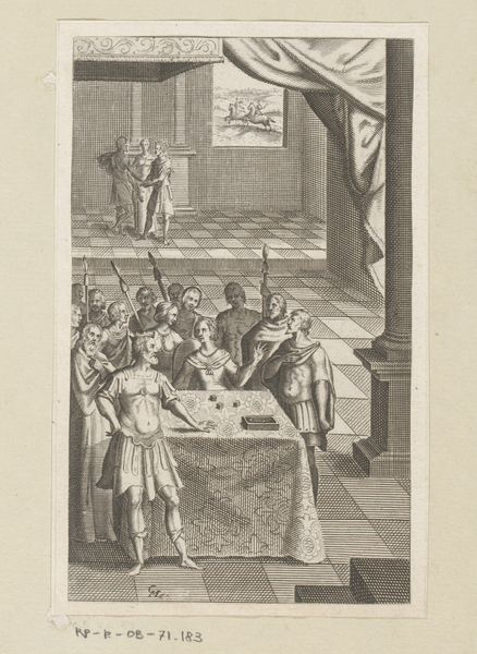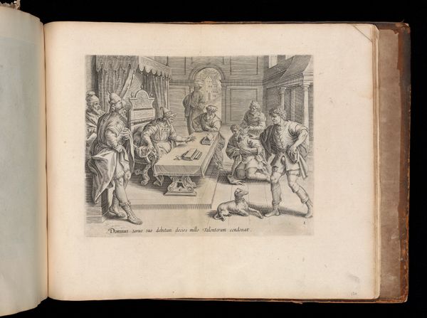 This print, titled "Koning scheldt de onbarmhartige dienaar zijn schulden kwijt", was made by an anonymous artist. It's an engraving, a process where lines are cut into a metal plate, which is then inked and printed. The image's starkness is due to the linear nature of engraving. Notice how the artist uses a dense network of lines to create shadows and volume, giving form to the figures and architectural setting. The narrative unfolds through the careful arrangement of these etched lines, capturing a moment of debt forgiveness. The labor-intensive engraving process mirrors the economic themes of the artwork. The precision and time required to produce such a print reflect the value of skilled labor in a pre-industrial economy. This print invites us to consider the social relationships, labor, and moral lessons embedded in its making and subject matter.