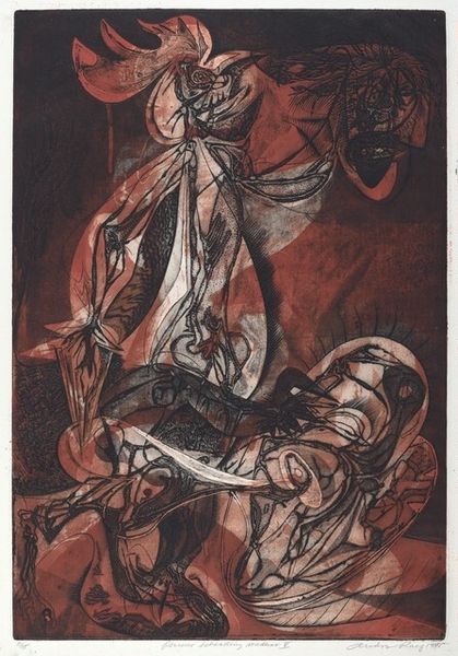 André Racz created this intaglio print, "Perseus Beheading Medusa, IV," in 1945. Racz’s surrealist take on the classical myth invites us to consider the politics of imagery and the social conditions of artistic production during and after World War II. The mid-20th century was a time of immense violence and social upheaval, and many artists turned to mythology as a way to grapple with the anxieties of the modern world. The story of Perseus and Medusa can be seen as a metaphor for the struggle between good and evil, order and chaos, or reason and irrationality. How does Racz's abstraction comment on existing social structures, or the institutions of art? Historians consult a wide range of resources to understand the place of art within its social and institutional contexts.
