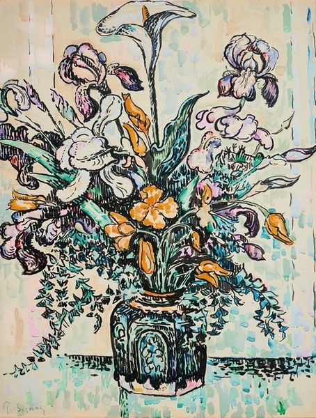 Curator: Helen Dahm’s "Blumenstilleben," painted in 1954, presents us with an interesting subject for our discussion. Editor: It certainly does. My first impression is of dense, almost oppressive vegetation rendered in a distinctly material fashion. The paint seems applied in thick, tactile layers. Curator: Indeed. The impasto application of gouache speaks to the Expressionist style Dahm was known for. Considering her involvement with the feminist art movement later in her career, I see an echo here of challenging traditional still-life depictions. The floral arrangement almost aggressively takes up space. Editor: Absolutely. Looking closer, you really sense the hand of the artist. The materiality itself—the texture and the sheer physicality of the gouache—becomes central. It’s not just a pretty picture, but rather an examination of the very stuff that constitutes art, its labour. Dahm emphasizes production rather than consumption, the process not the object. Curator: And her position as a woman artist further enriches the discussion. Throughout art history, floral still lifes were a typical, 'safe' subject matter for female artists, Dahm’s rendering disrupts any expectations of delicacy. It boldly reclaims the genre. The rather subdued colour palette even challenges the traditional feminine association of flowers. Editor: The thick application does seem almost to resist elegance. It makes me think about where the materials came from, her relationship with making and with labor. Gouache production is a distinct and intensive industry—who were those laborers and how did that context influence this choice of paint? Curator: A great point. Dahm's lifelong commitment to social justice, stemming from her involvement with the Bruderhof community, underscores her radical intent. She seems to me to be using the materiality as a form of embodied expression, challenging the social constraints of her time through her choice of medium and execution. Editor: Thinking about those production lines gives me pause in consideration of consumption as a primary interaction with artworks like these. Blumenstilleben certainly reminds me to critically consider that engagement and my own reaction as part of the wider world it emerged from. Curator: Well, Dahm’s "Blumenstilleben" does much more than just represent flowers. Editor: Yes, I appreciate how it pushes viewers to confront the tangible realities and labor underlying the very art we admire.