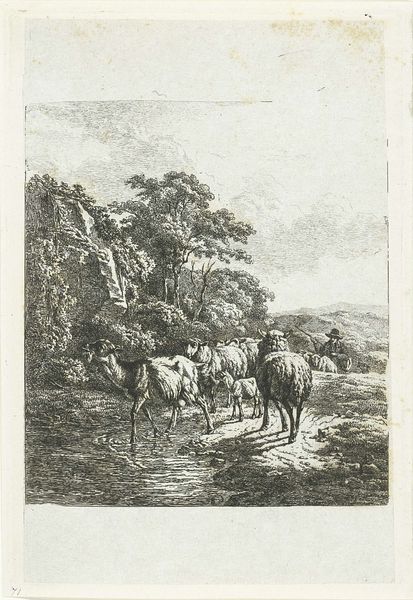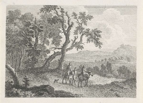 Editor: Here we have "Hilly Landscape with Hunters on Horseback" by Dirk Maas, dating back to about 1680 to 1690. It’s a pen and ink drawing, very delicate. What I find striking is the almost casual arrangement of figures amidst such an expansive landscape. What do you see in this piece? Curator: The first thing that strikes me is how the landscape itself seems to almost participate in the narrative. The way the trees are drawn, bending and swaying, it's not just a backdrop, but a visual metaphor for the hunt itself. Look at how the figures on horseback are situated under the large tree -- are they seeking counsel? Consider what the hunt represents – dominance, control, and the social rituals associated with aristocracy. Editor: So, it’s not just a picture of a hunt, but a symbolic representation of power? Curator: Precisely! Think of the horse – throughout art history, it’s been a symbol of virility, power, and nobility. Their presence, arranged within this hilly domain, reinforces notions of land ownership and social hierarchy. Ask yourself, what does it mean that they're rendered with such precision in contrast to the more generalized landscape around them? Editor: It’s like they’re claiming ownership, visually setting themselves apart from the wildness of nature. The level of detail does draw the eye immediately to the figures. Curator: And doesn’t that claim, rendered in ink, remind you of a kind of historical record? Perhaps a deliberate message about permanence and the continuation of power. It really encourages you to look beyond just what’s depicted and towards its meaning. Editor: I didn't think about it like that at first. Looking closely, it becomes much more than just hunters in a field. Thank you. Curator: Indeed. Every mark tells a story, and recognizing those symbols is the pleasure of art.